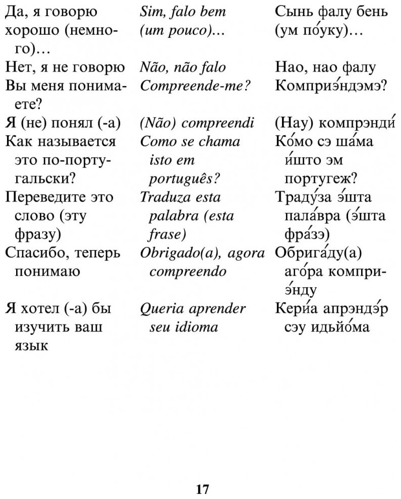 Обычный представитель разговорников. Есть транскрипция португальских выражений на русском языке. Поможет на элементарном уровне изъясниться в португалоязычных странах, если человек до этого не изучал португальского языка. Но для более глубокого изучения языка нужен основательный учебник.