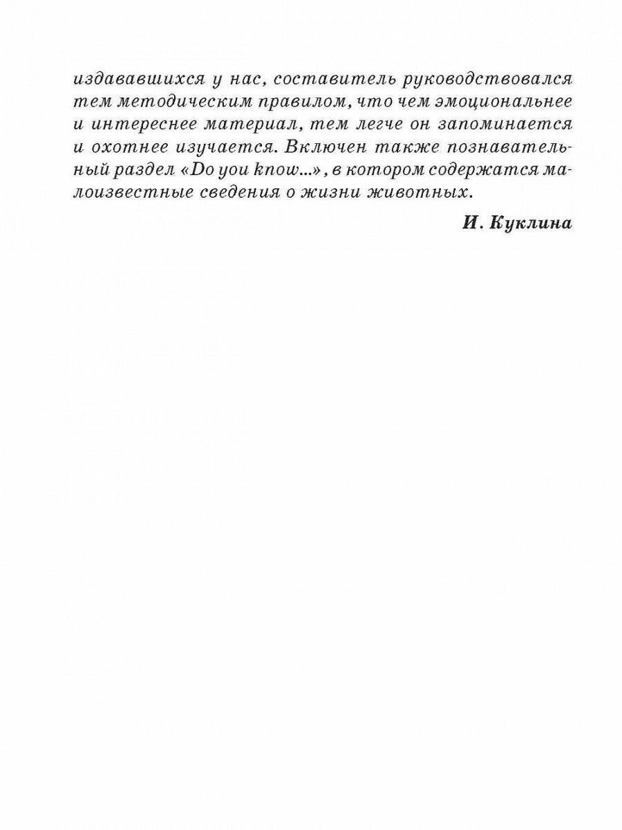 Материал сборника идеально подходит для обучения чтению и развитию разговорной речи у учеников младших и средних классов. В книге собраны веселые сказки и рассказы, интересные факты, анекдоты о животных. Каждый рассказ снабжен словарем, вопросами, упражнениями на перевод и грамматической справкой. В конце книги имеется словарь. В качестве приложения даны подробные схемы различных видов вопросов, которые помогут в тренировке диалогической речи.