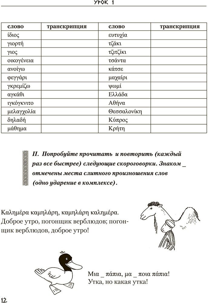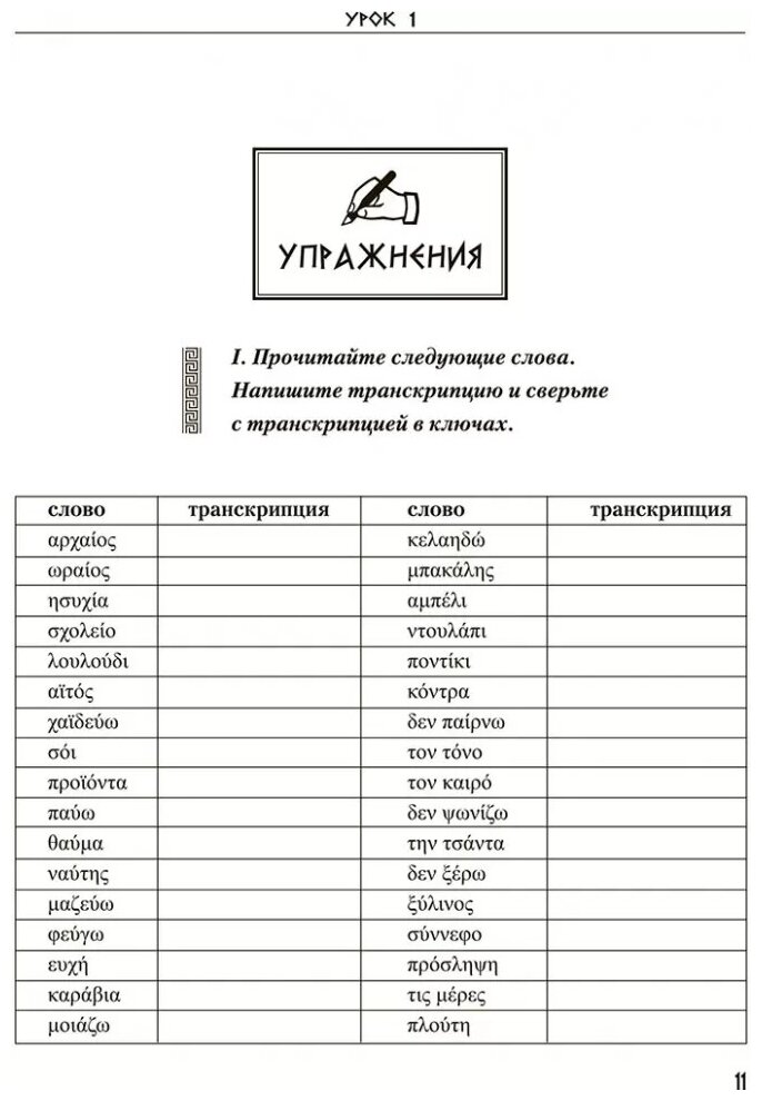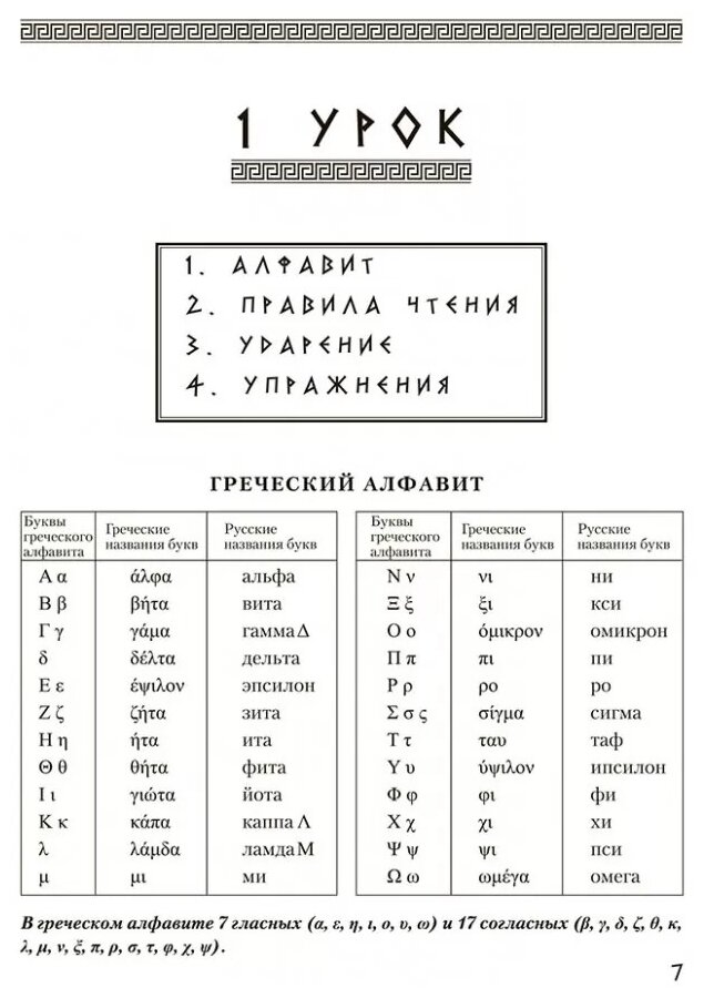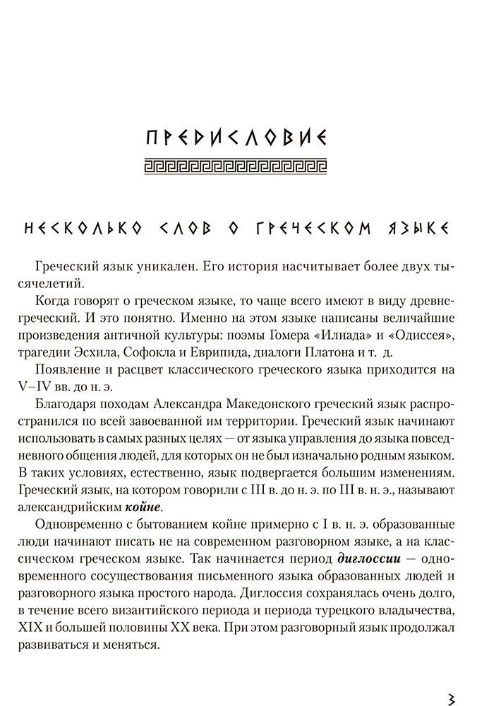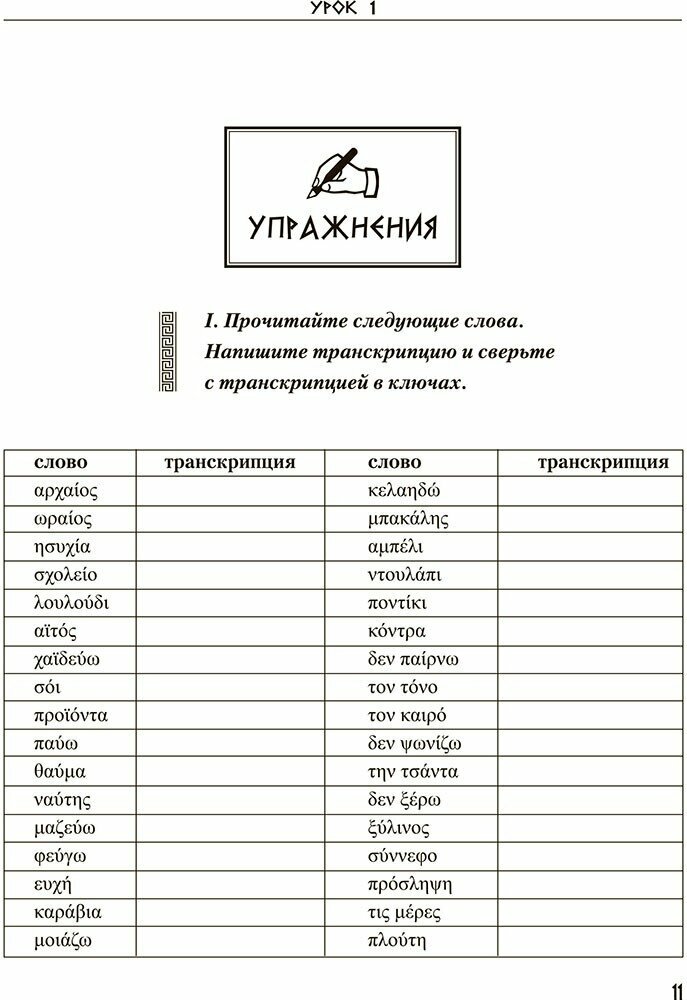 Хороший учебник, хотя одного его мало, дополнительно нужен словарь, так как часто нелегко найти перевод слова из текста в самом учебнике. Транскрипция дана на английском, то есть классически, хотя для русского чеговека греческие звуки проще излагать на русском в силу схожести как звучания, так и написания (есть только 3-4 специфических звука).