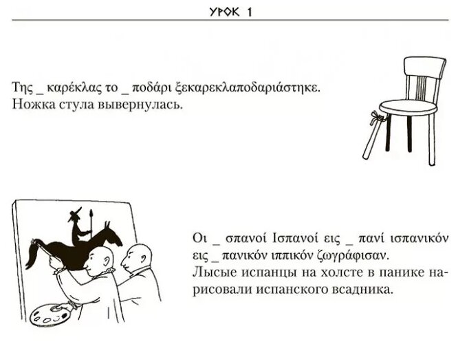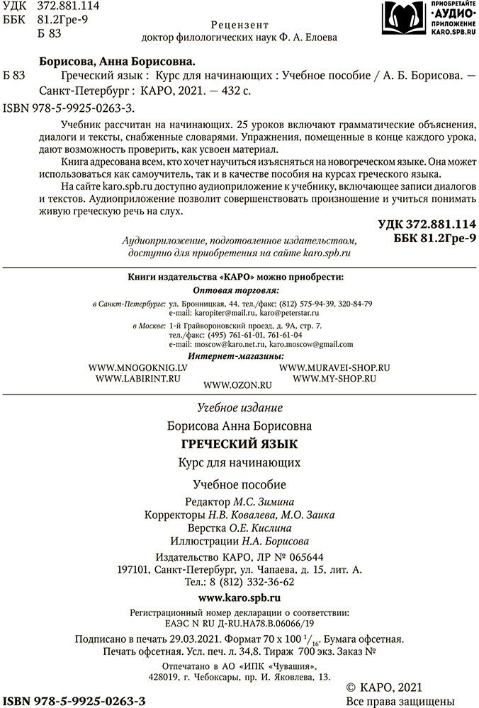 Очень хорошее качество печати, плотная бумага, большой формат. Не смотря на то, что греческих язык один из самых трудных языков, с этим самоучителем выполняя урок за уроком очень легко и интересно учиться. В книге говориться про CD, но в комплекте его нет. Было бы хорошо ещё и иметь озвученные тексты данные в книге.