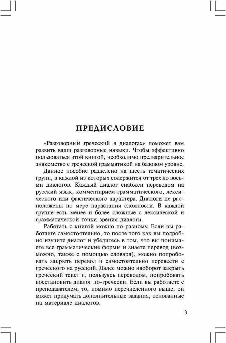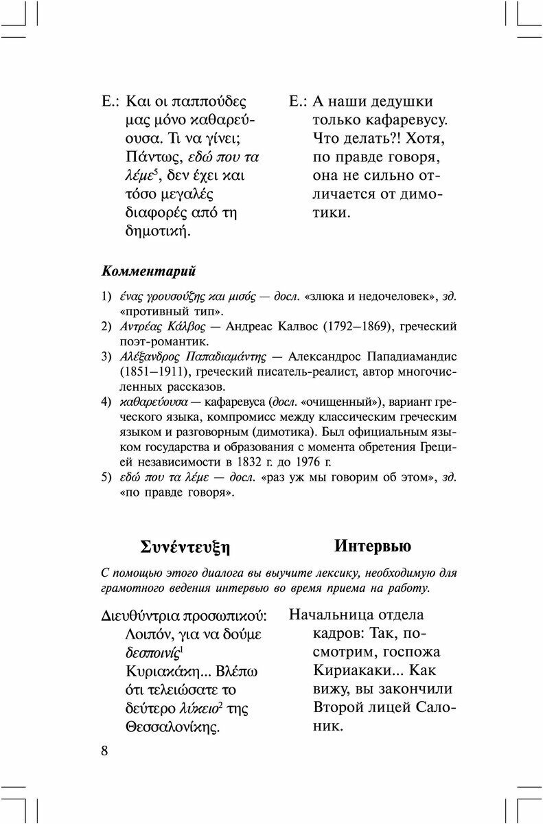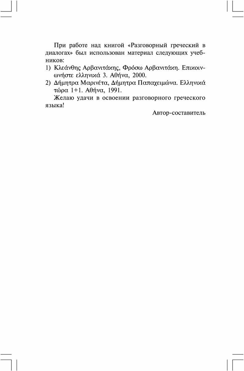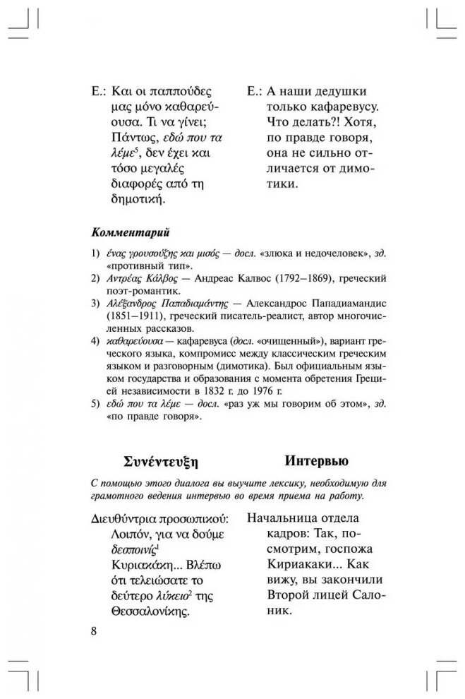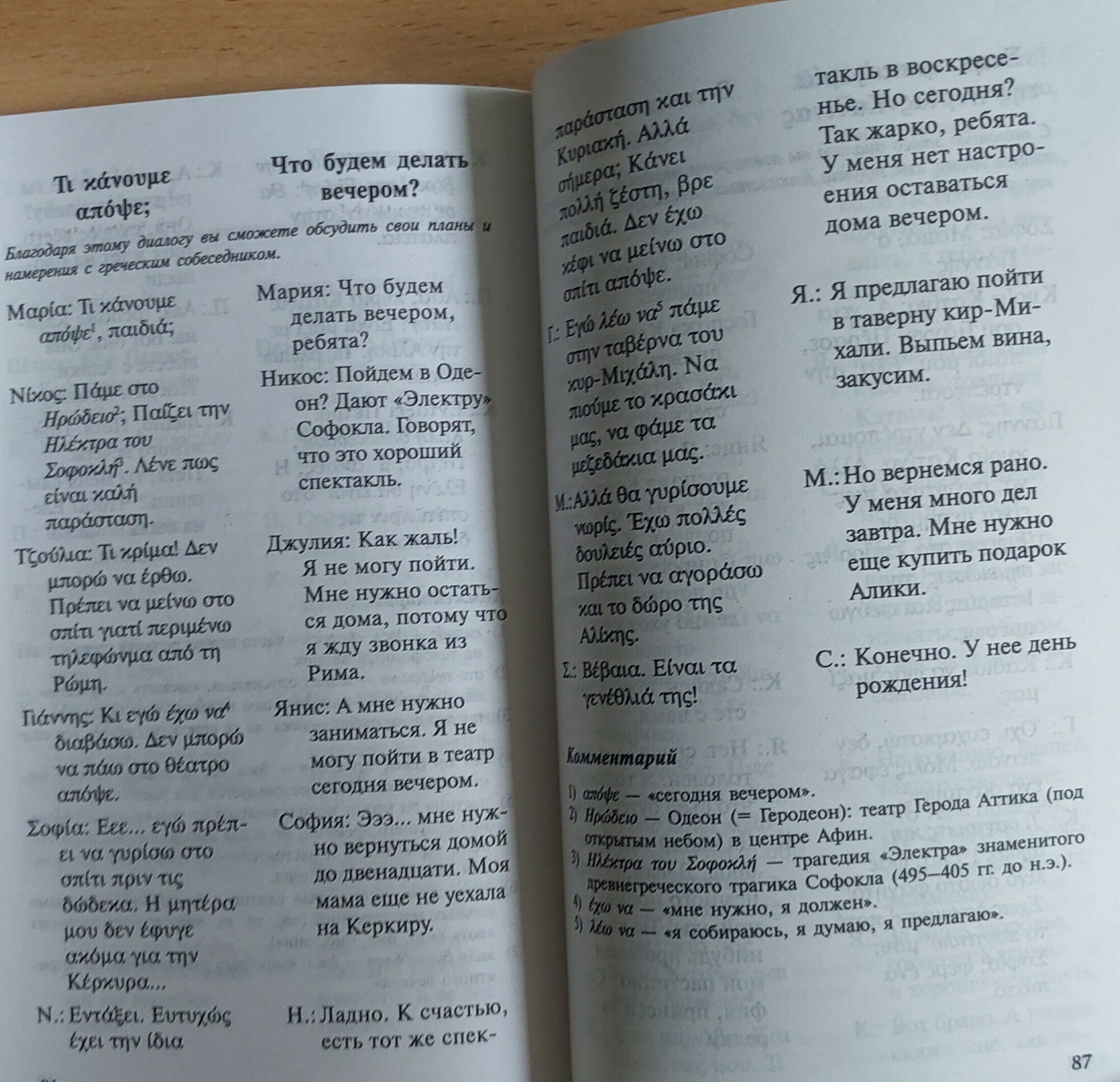Все диалоги данной книги без изменений взяты составителем из двух греческих учебников: «Эллиника тора» и «Эпикинонисте эллиника», о чем сообщается составителем в предисловии, т.е.это оригинальные «родные» греческие тексты, и их качество идеальное. Диалоги нескучные, с юмором, живые и поэтому их легко заучивать/часто повторять, без чего невозможен процесс усвоения разговорного языка. Из недостатков книги – всё-таки параллельная колонка русского текста сильно мешает и отвлекает от погружения в греческий, т.е.желательно русский текст было бы вынести в отдельный раздел. Кроме того, в книге очень маленький объем диалогов (всего 31 диалог), которого недостаточно для освоения уровня хотя бы B2, т.е.для полноценного освоения уровня нормального бытового общения диалогов должно быть хотя бы в 2-3 раза больше.