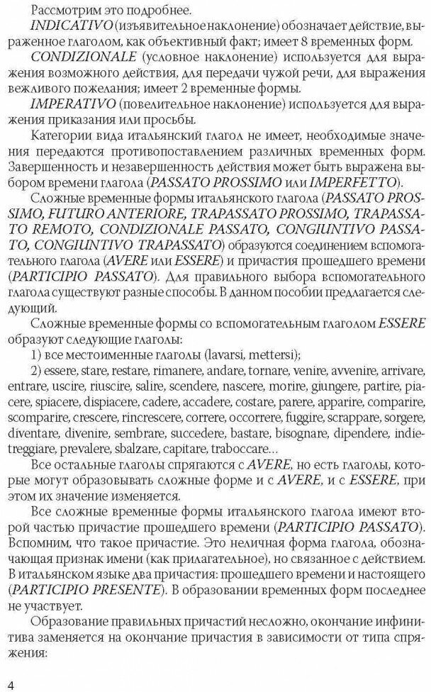 Книга - очень полезный справочник по итальянским глаголам, он охватывает довольно большое количество самых употребительных глаголов, показывает их спряжение во многих грамматических временах. Порадовало, что в книге практически отсутствуют опечатки, особенно в изданиях последних лет. Однако небольшим недостатком книги может служить отсутствие грамматических комментариев в случаях, когда в зависимости от значения или ситуации употребления один и тот же глагол может спрягаться с разными вспомогательными глаголами.