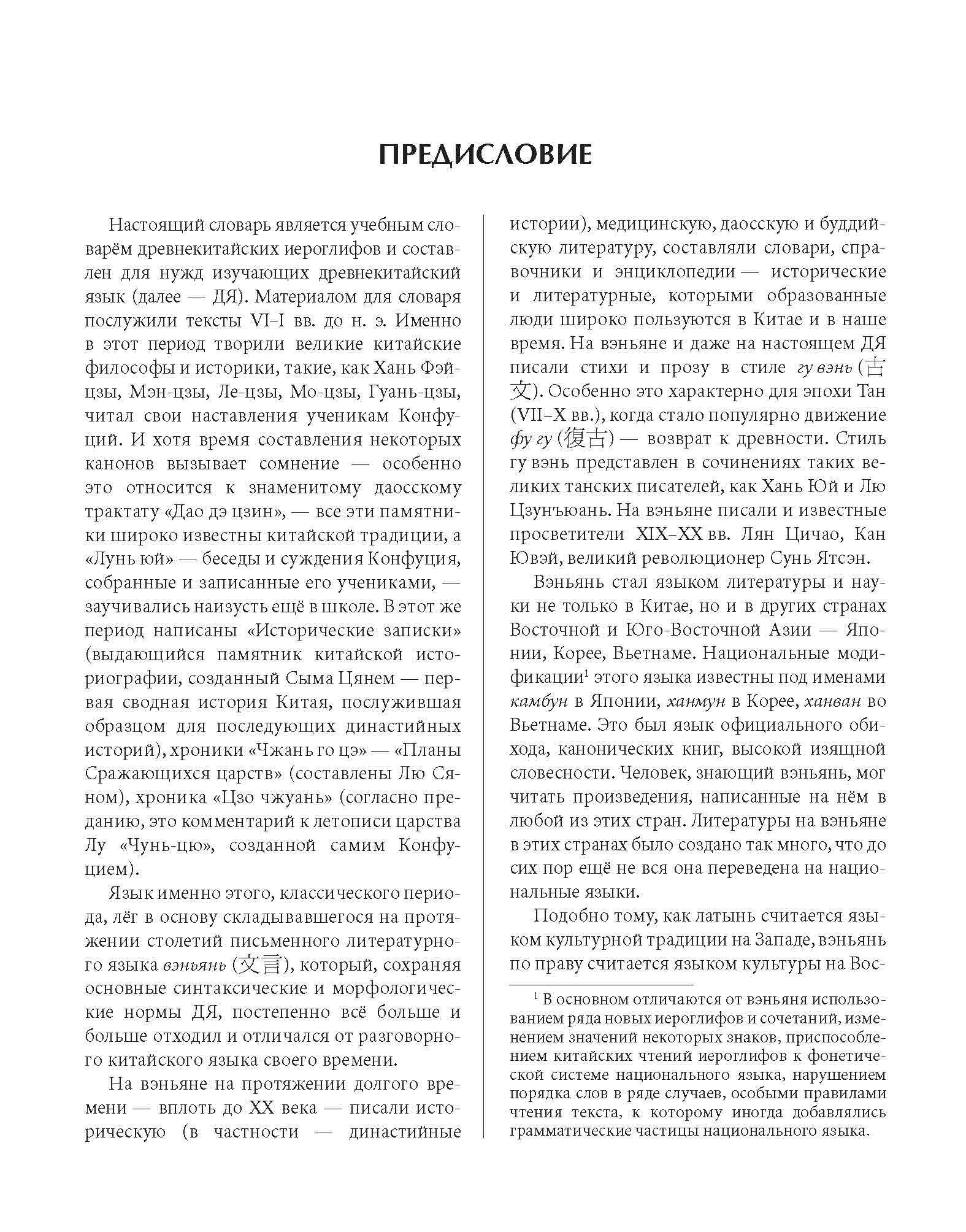 Древнекитайский язык необходимо изучать еще и потому, что многие его грамматические конструкции используются в публицистическом стиле современного китайского языка - в газетных статьях, в научной и специальной литературе, в партийных и деловых документах. Словарь содержит 1120 гнездовых иероглифов и включает в себя иероглифические указатели и словарь омографов.