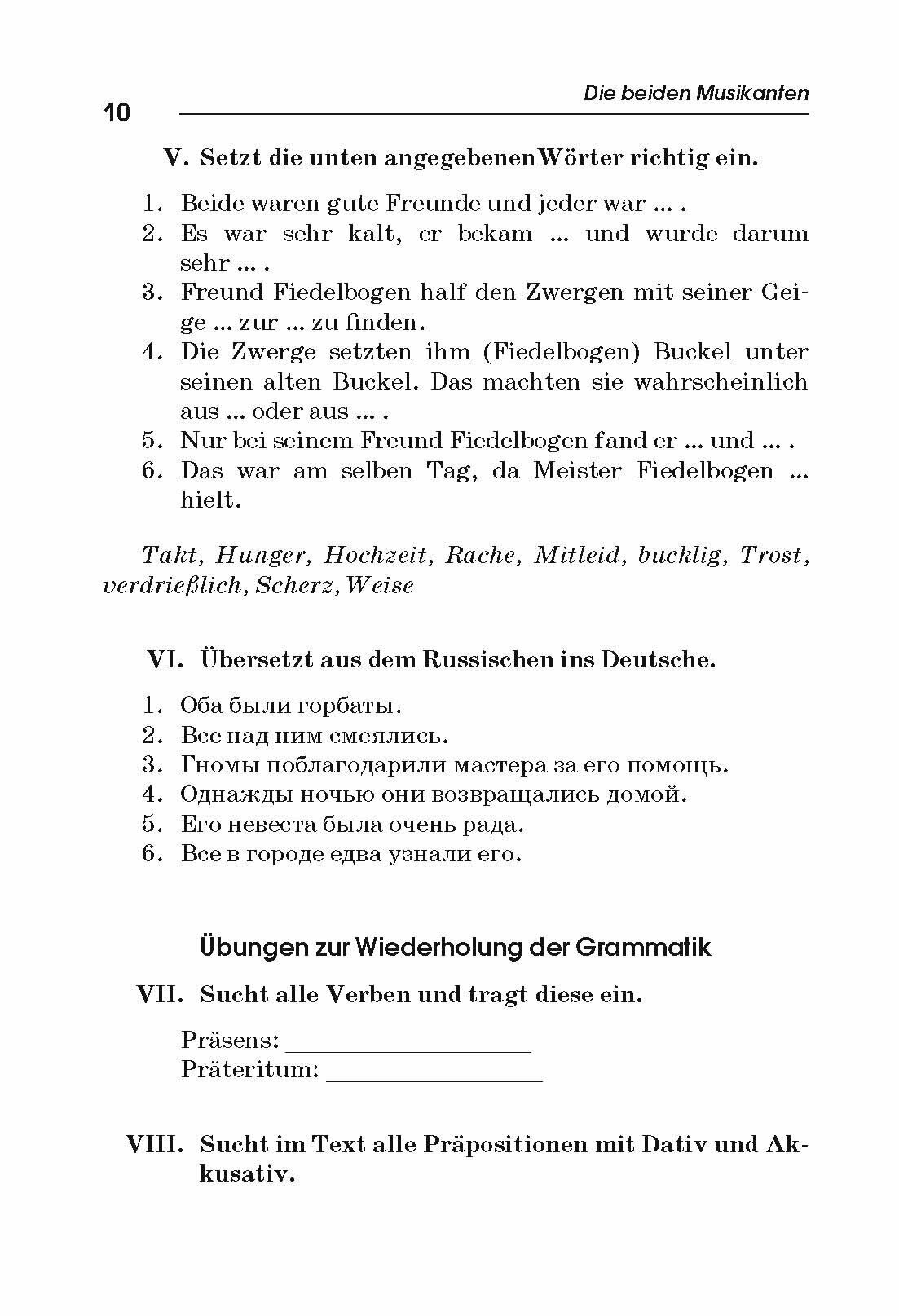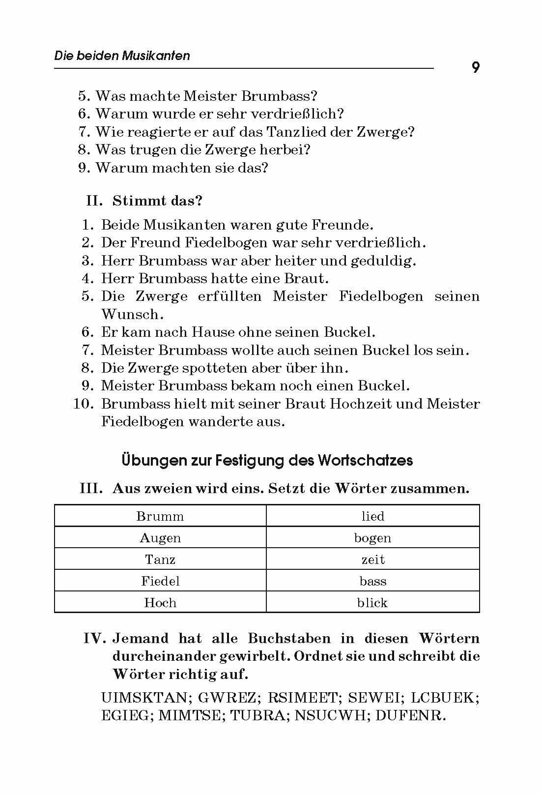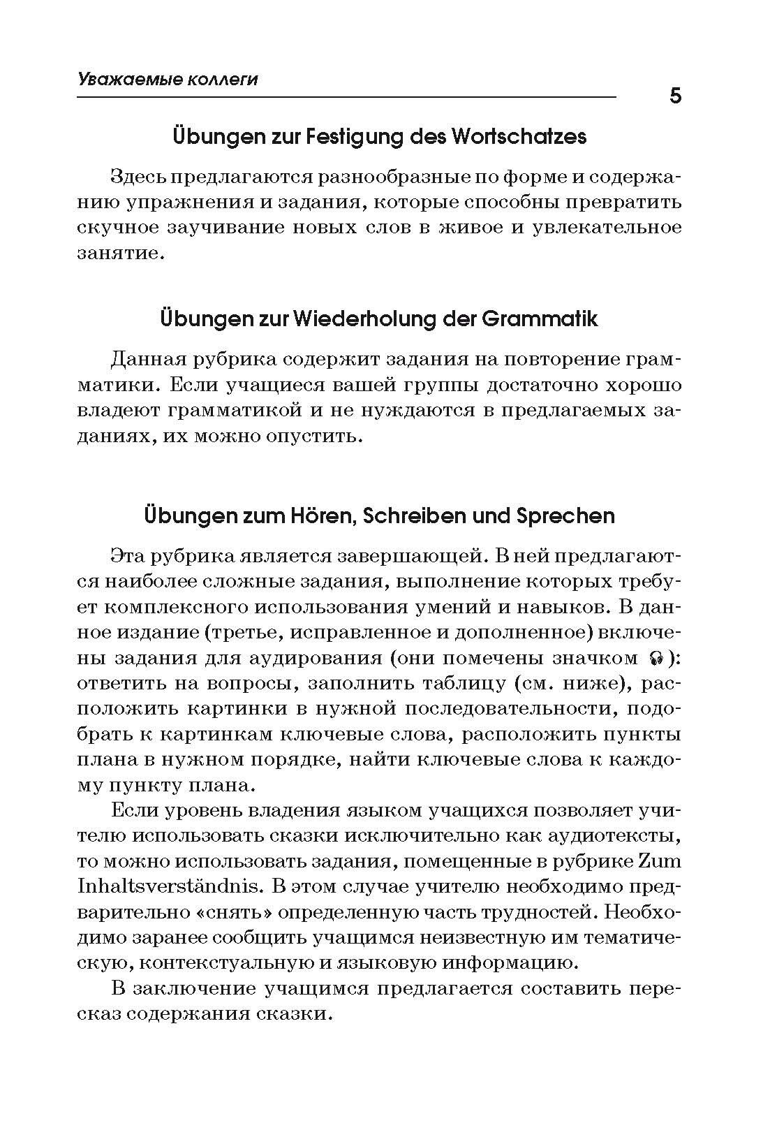кроме того, озвучены некоторые упражнения. В конце каждой сказки приведены вопросы по тексту. Далее предлагаются различные упражнения на грамматику (вставьте нужный предлог, правильно напишите слово по смыслу предложения, связанное, конечно, с вышеприведенной сказкой и т.п.). Есть упражнения по переводу предложений с русского языка на немецкий. В конце даны сложные упражнения: расположить картинки в нужной последовательности, заполнить таблицы. В самом конце книги приведен немецко-русский словарик.