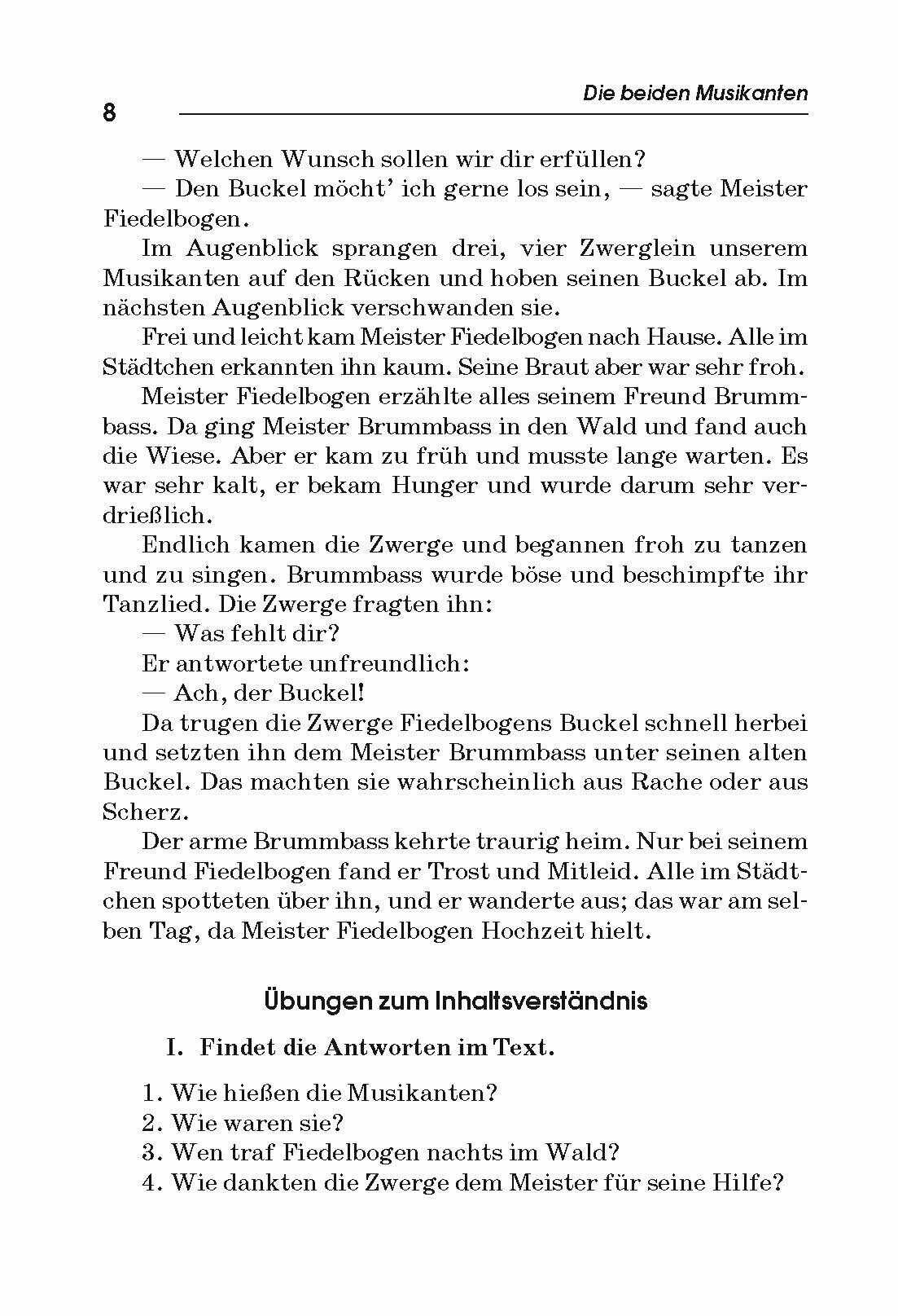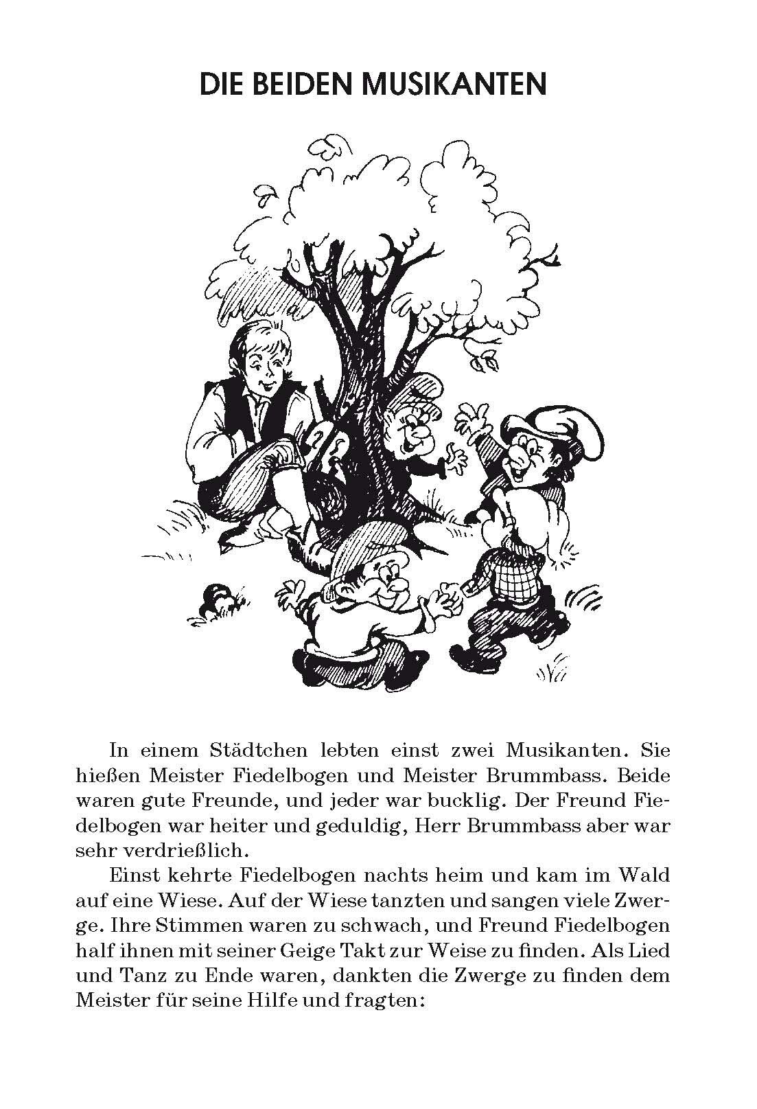Книга состоит из 19 сказок: Die beiden Musikanten, Das Almosen, Der Arme und der Reiche и других. Текст адаптированный, примерно 1-2 страницы половины формата А4. В начале сказки небольшой черно-белый рисунок. Книжка продается вместе с диском, на котором дикторским голосом, ровным тембром прочитаны все сказки