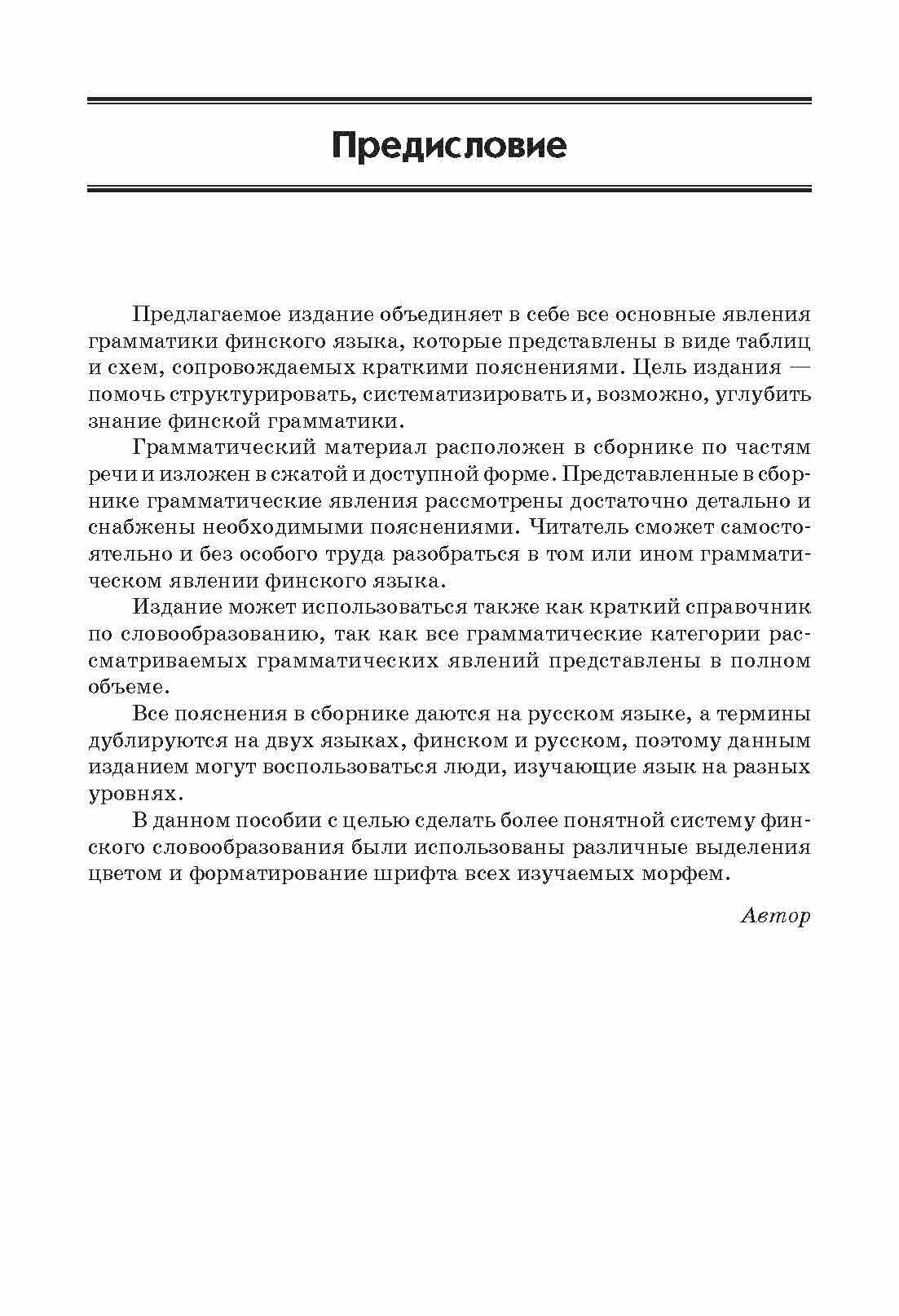 Оно призвано помочь изучающим финский язык систематизировать и структурировать знания по грамматике. Основные грамматические правила представлены наглядно - в виде таблиц, схем и кратких пояснений. Все объяснения даются на русском языке, что делает возможным использование пособия на разных этапах изучения языка. Кроме грамматики освещаются и некоторые лексические трудности, с которыми часто приходится сталкиваться учащимся.