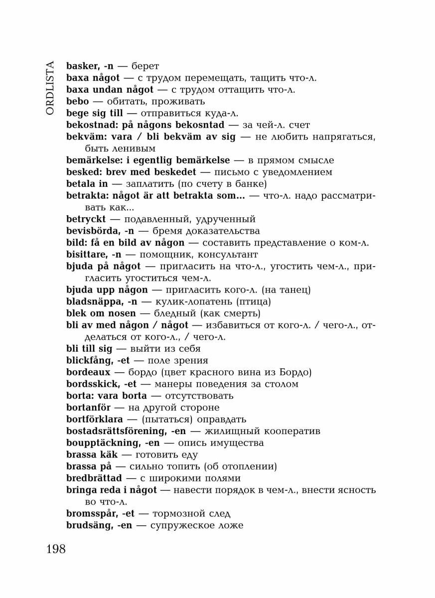 Хотя рассказы в книге неадаптированные, даже с очень средним знанием шведского языка читать можно и нужно. Во-первых рассказы очень небольшие (по 10-15 страниц), следовательно, действия здесь преобладают над описанием и вы быстро выучите шведские глаголы. Во-вторых, словарь включает в себя не только слова и устойчивые выражения, но и формы слов, например, артикли существительных, ведь учить шведские слова без артиклей бессмысленно.