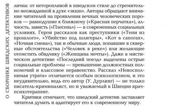 Предлагаемый вниманию читателей сборник состоит из 15 рассказов шведских мастеров детективного жанра. Авторы рассказов, представленных в книге, являются членами Шведского Союза Писателей-криминалистов и обладателями различных литературных премий. Многие из них (Я. Е. Арвастсон, К. Е. Генберг, У. Дурлинг и др.) считаются признанными мэтрами детективного жанра в Швеции и за ее пределами, их произведения переведены на разные языки мира, по их сценариям сняты фильмы и телесериалы. В сборнике приводятся рассказы одного из самых плодовитых писателей Швеции - Я. О. Экхольма, автора более 200 книг, и одного из самых читаемых в Швеции - О. Сведелида. Неадаптированный текст рассказов снабжен комментариями и словарем.