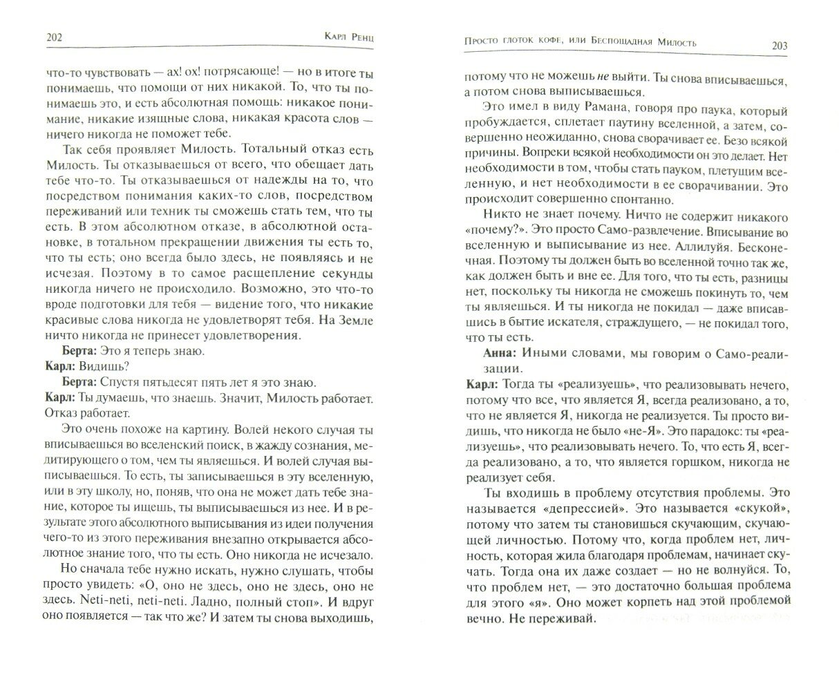 Карл Ренц - просветленный учитель недвойственности из Германии. Важность того, что происходит, когда вы читаете Карла, заключается не в значении его идей, а в чем-то гораздо более глубоком и непостижимом. Карл, с которым мы сталкиваемся в этой книге, полностью уничтожил идею "личностности" в себе и в своем восприятии других. Он смотрит на тех, кто задает вопросы, и отвечает им, но для него - некому видеть и некого видеть, некому говорить и некому слушать; есть только То, которым он является, которым являетесь и вы. Он говорит только с Тем, а не с личностью, которой вы себя мните, и при чтении его слов его видение, возможно, станет и вашим.