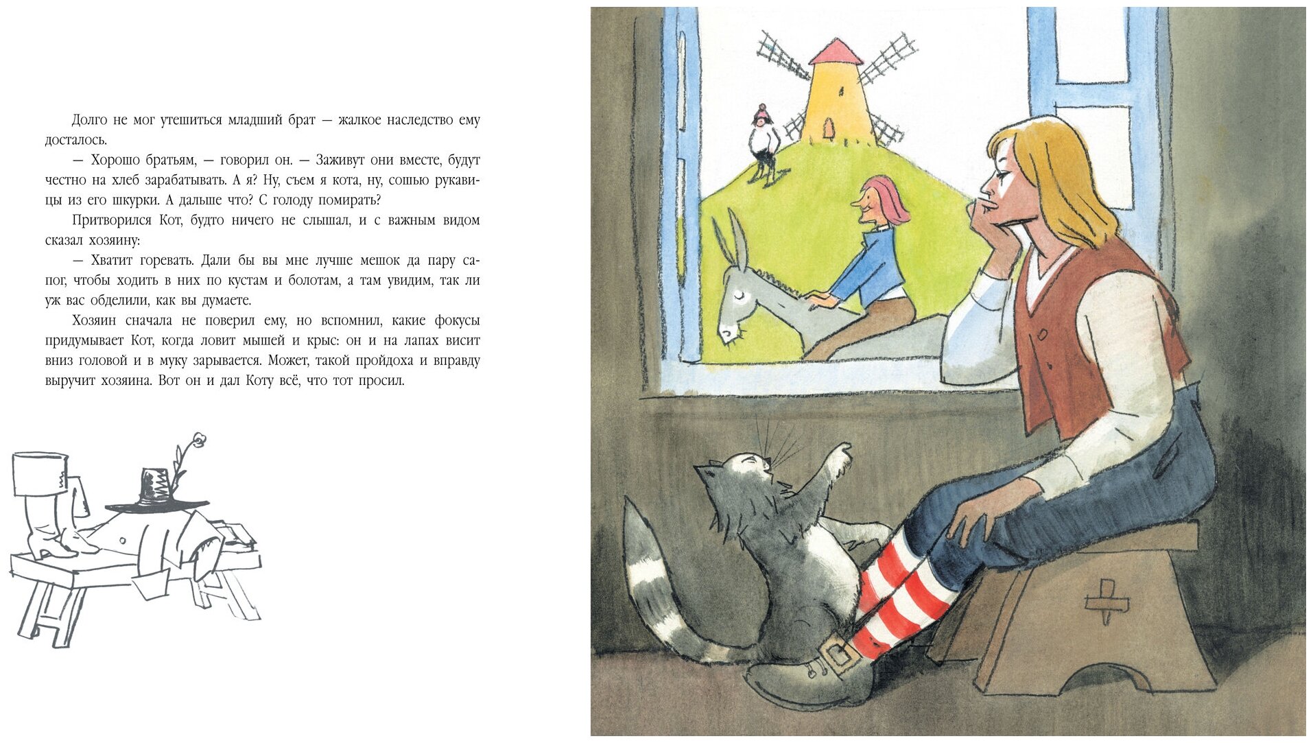 Долго выбирала "Кота в сапогах" и купила этот вариант для 4-ех летнего сына. Книга понравилась нам обоим. Картинки увлекают, текст приятно читать. Качество издания достойное, хотя размер книги не стандартный и книга не убирается в нашу книжную полку, что не очень удобно. Еще меня смутила фраза в начале книги:" Братья наследство сами поделили, в суд не пошли: жадные судьи последнее отберут." Я не помню была ли эта фраза в книги моего детства.
