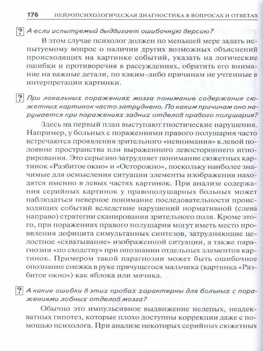 Очень хорошее пособие для тех, кто решил углубиться в изучение нейропсихологии и методов исследования, применяемой данной области науки. В этой книге можно найти ответы на многие часто возникающие у начинающего нейропсихолога вопросы. В книге 3 части: общая характеристика нейропсихологической диагностики, методики исследования психических функций, методики исследования латеральных аспектов функциональной организации мозга.