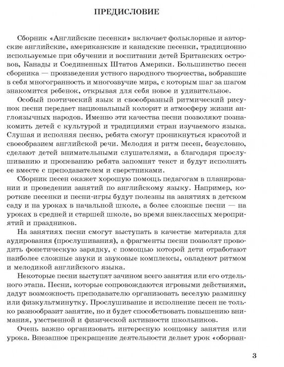 Дети с удовольствием играют, слушают песни и поют сами. Поэтому данный сборник, включающий английские, американские и канадские песни, будет полезен на занятиях. Когда ребята слушают и поют песни, они знакомятся с культурой англоязычных народов и незаметно для себя запоминают новые слова и выражения.