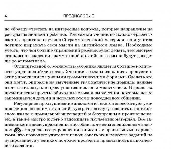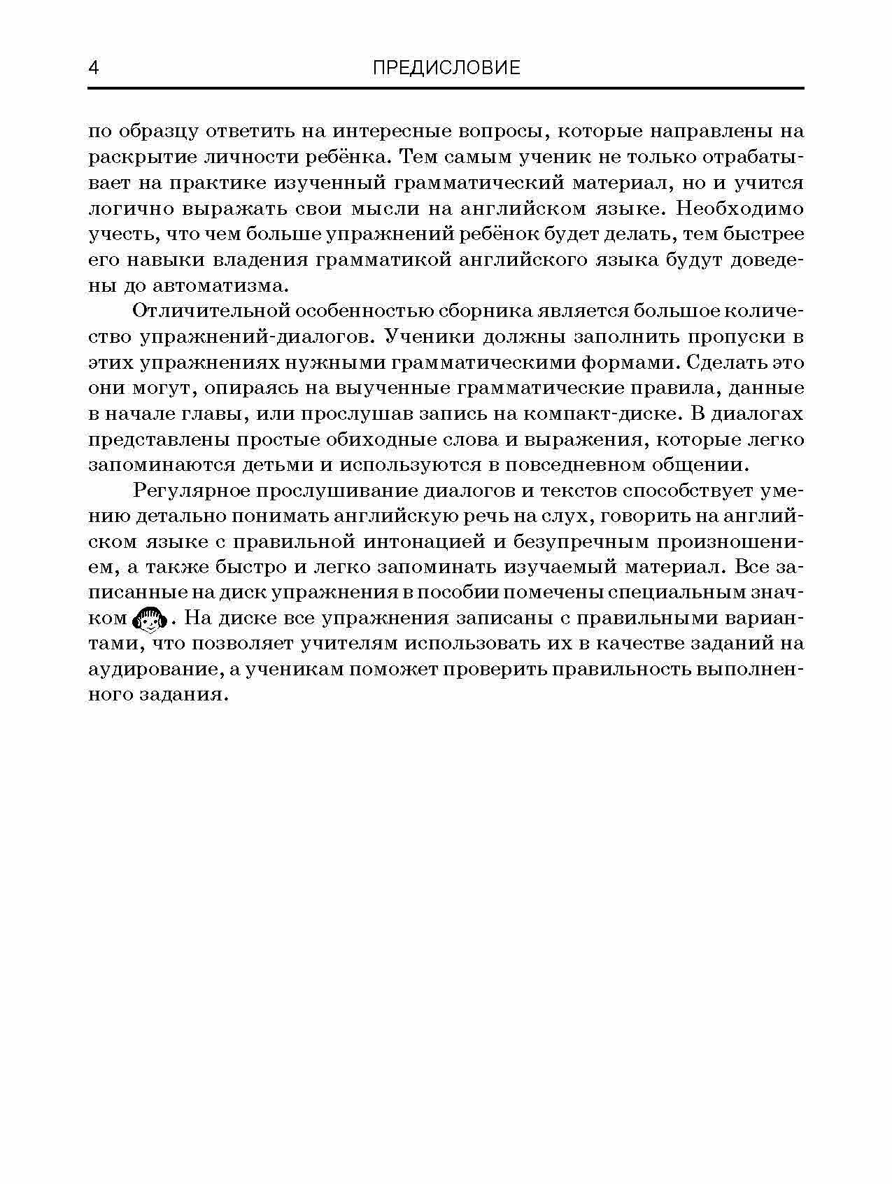 Материал сборника разделен на главы, каждая из которых включает в себя словарик, в котором даны необходимые для выполнения заданий слова, грамматические правила и упражнения к ним. Правила даны в виде простых схем и проиллюстрированы примером. Разнообразные упражнения направлены на закрепление грамматического материала и развитие у учащегося способности свободно выражать свое мнение на английском языке. Небольшие тексты, представленные в виде упражнений на заполнение пропусков, повествуют школьникам о жизни их англоговорящих сверстников, что способствует расширению знаний ребенка о странах изучаемого языка.