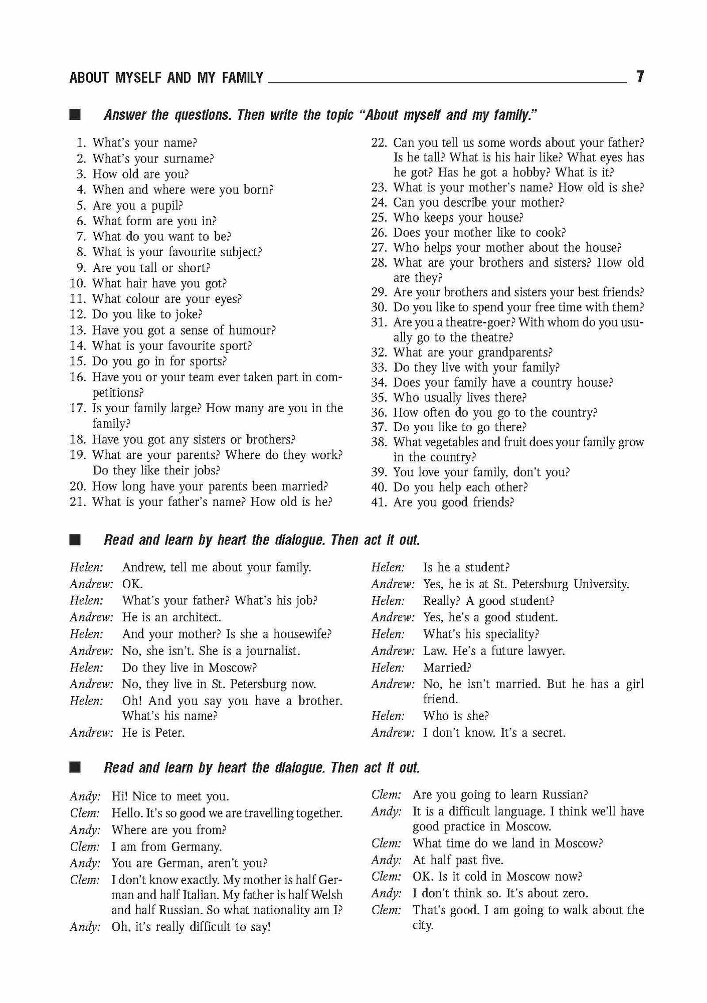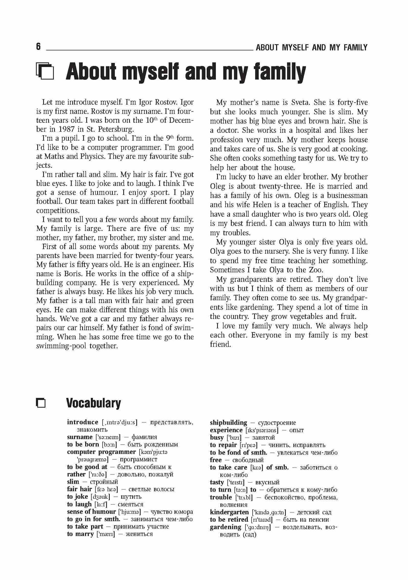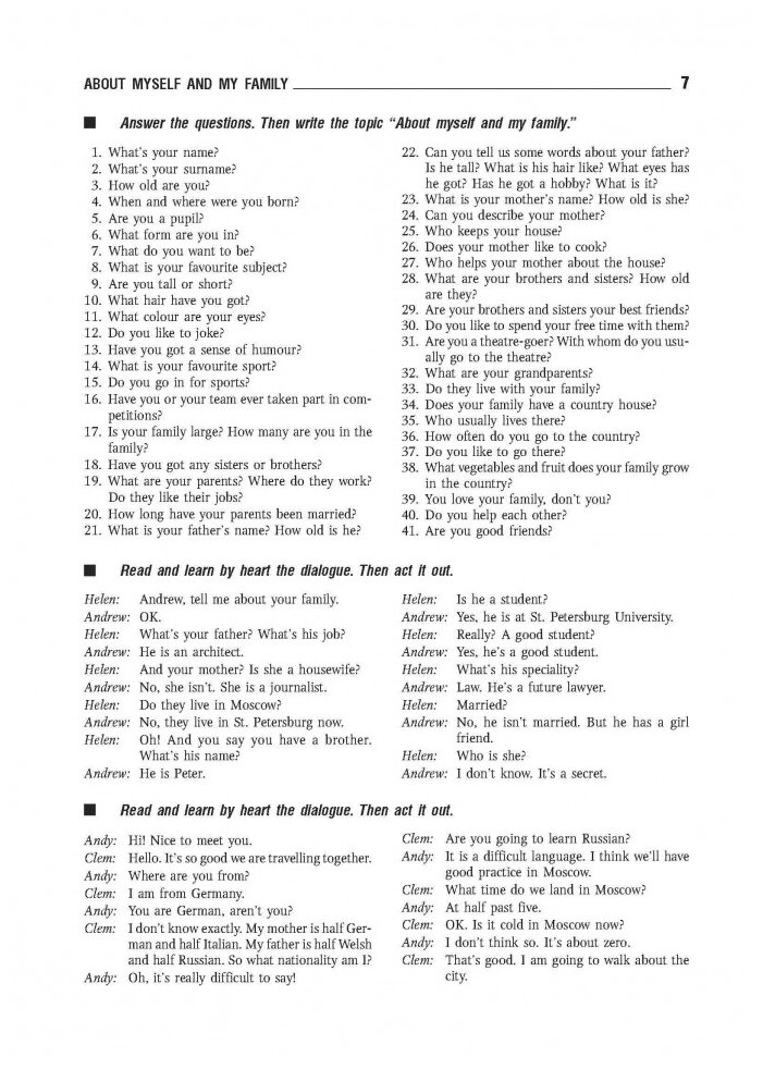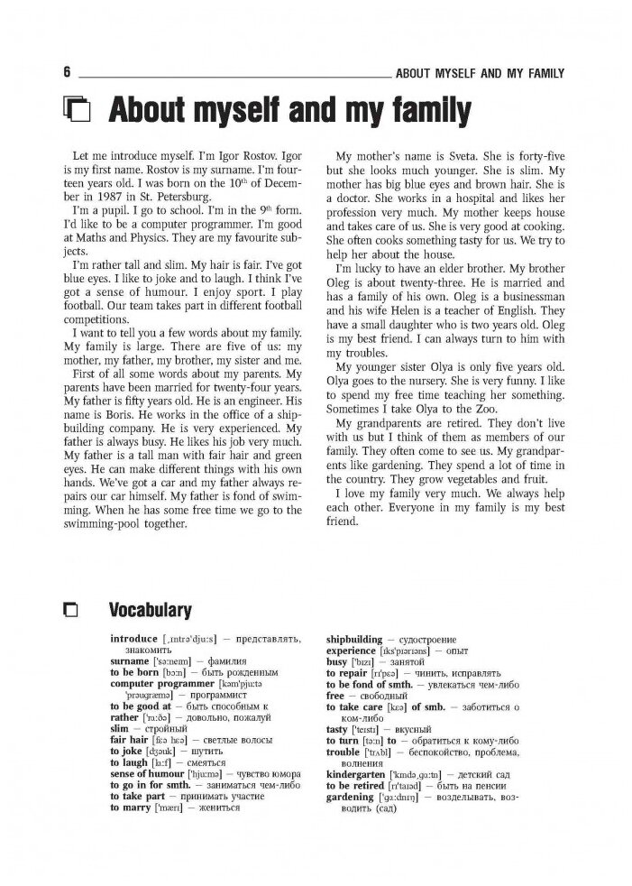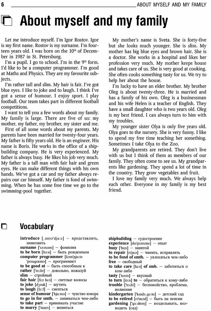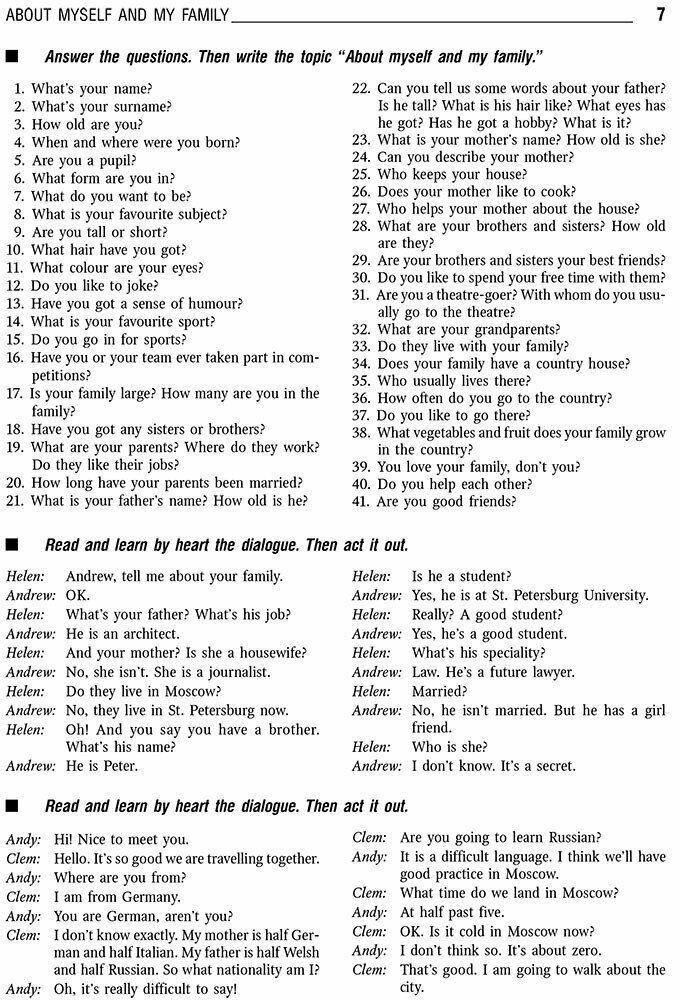 В пособии представлен широкий выбор программных тем, упражнений и диалогов. Каждая тема снабжена словарем, в котором даны новые слова, встречающиеся в тексте. После каждой темы следует ряд вопросов и упражнений, с помощью которых учащиеся смогут закрепить прочитанный материал. Диалоги к темам представляют собой образцы живой английской речи. В них даются обиходные слова и выражения, знание которых поможет ученикам легко вести беседу на английском языке.