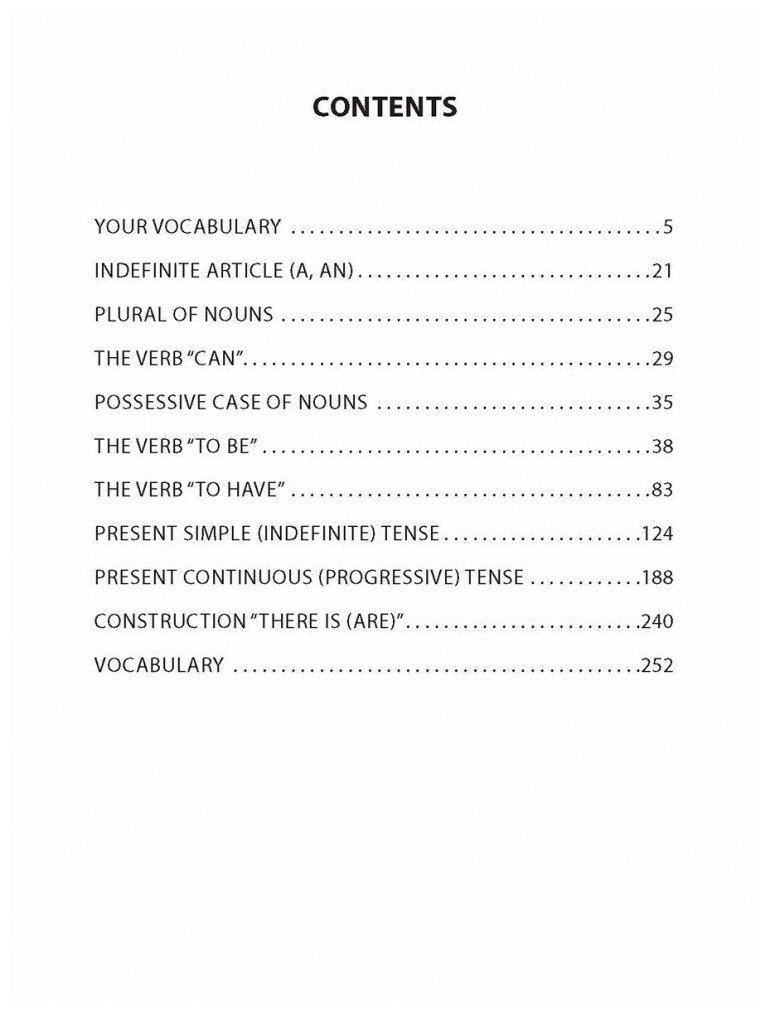 Данный учебник предваряет небольшой словарь с лексикой по основным темам: семья, цвета, времена года, животные, профессии, еда и т.п. Далее идут грамматические правила и упражнения к ним. Правила оформлены в таблицы. Упражнений по каждому разделу много, они разноплановые, написаны крупным шрифтом. В конце книги - англо-русский словарик.