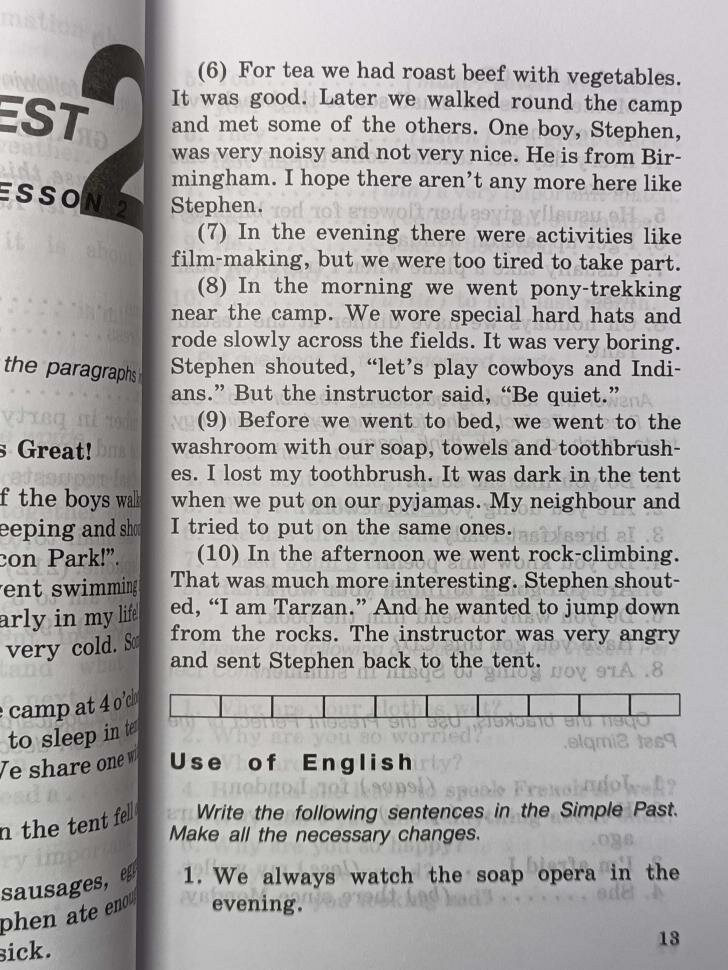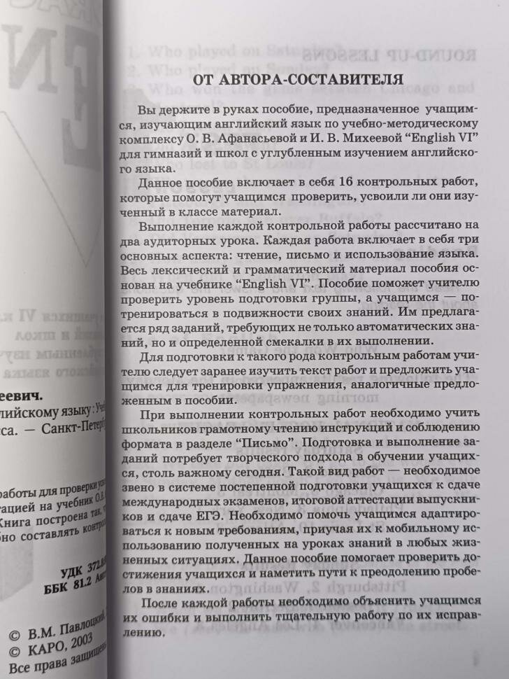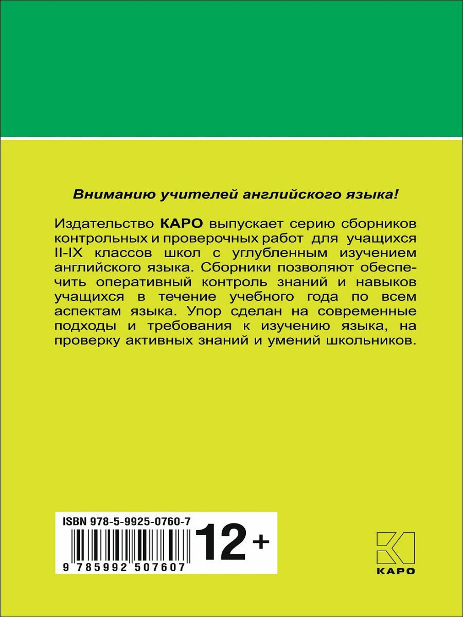 Очень хорошее пособие, которое содержит 15 контрольных работ, а также итоговую годовую работу. Каждая контрольная работа включает в себя три основных аспекта: чтение, письмо и использование языка. Все задания построены применительно к современным требованиям, а лексический и грамматический материал пособия основан на учебнике О.В.Афанасьевой, И.В.Михеевой "English VI". Пособие поможет учащимся проверить свои знания, насколько хорошо они усвоили изученный в школе материал, подготовиться к школьным тестам, убедиться в надежности уже имеющихся знаний. Книга поможет и учителю - организовать контроль знаний и умений учащихся, проверить уровень их подготовки.