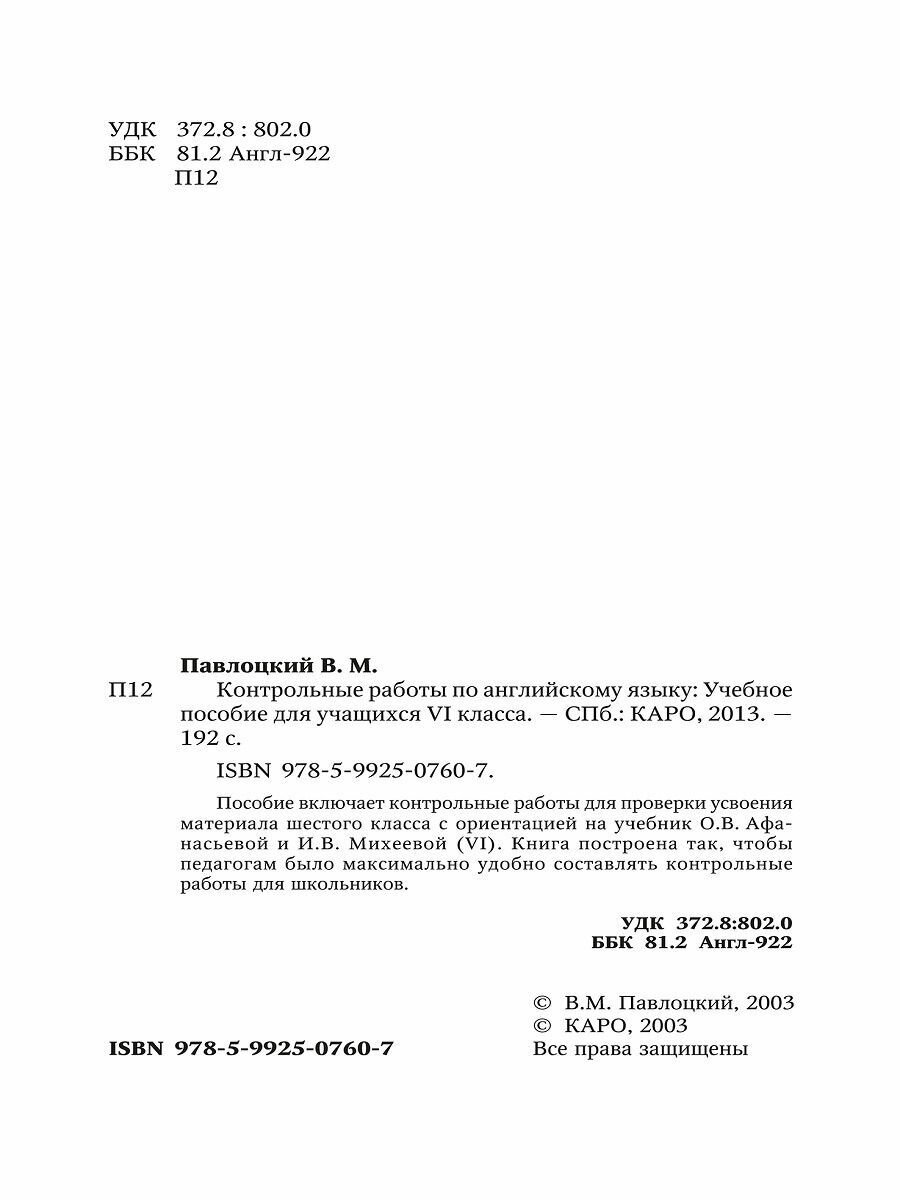Контрольные работы по английскому языку. Для учащихся 6 класса гимназий и школ с углуб. изучением (Павлоцкий Владимир Моисеевич); Каро, 2017