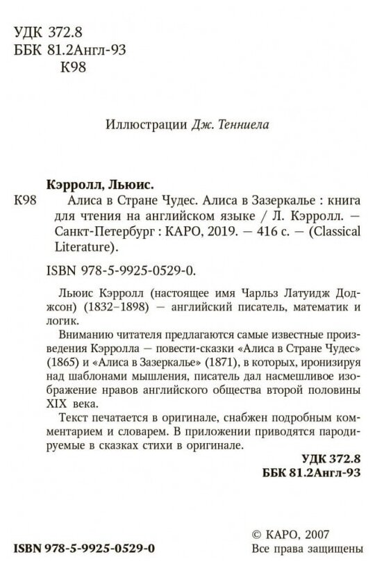 Alices adventures in wonderland. Алиса в Стране Чудес.Алиса в Зазеркалье: Книга для чтения на английском языке (Кэрролл Льюис); КАРО, 2021