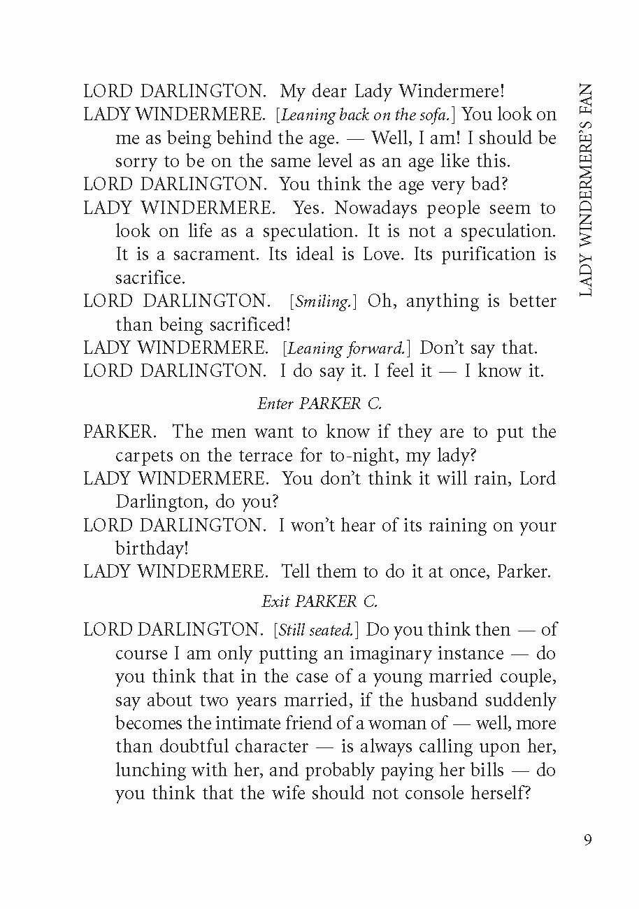 В трех самых известных своих пьесах ("Веер леди Уиндермир", "Как важно быть серьезным", "Идеальный муж") он предоставляет читателю право самому ответить на животрепещущие вопросы: следует ли безоговорочно доверять своей второй половине? Надо ли идеализировать спутника жизни или лучше принимать его со всеми недостатками? Прощать за ошибки, совершенные в прошлом, или безжалостно осуждать, сокрушая то, что строилось годами?