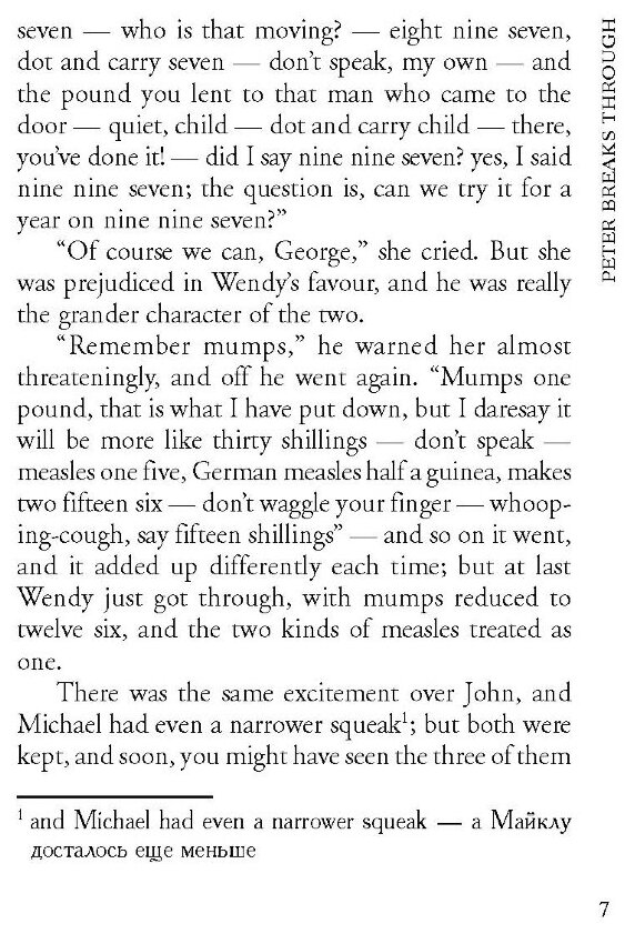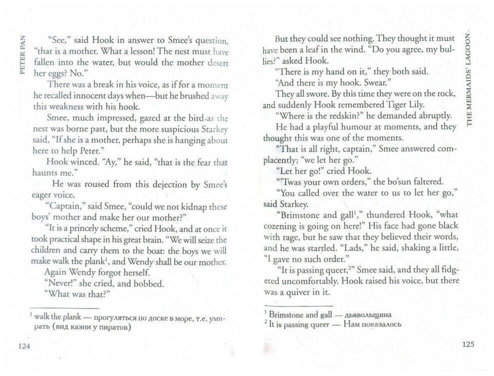 Прекрасная книга для тех, кто хочет начать читать книги в английском оригинале."Питер Пэн"читается очень легко, увлекательно и интересно. Сказка, написанная английским писателем Джеймсом Барри, давно уже стала классикой детской литературы.Я думаю, что о содержании этой книги можно и не говорить, этот сюжет знаком каждому.Это очень душевная и атмосферная книга. В данном издании для облегчения есть постраничные комментарии и переводы сложных слов. В конце книги также есть словарь. Книга содержит неадаптированный (полный) текст, для чтения необходим средний уровень английского. Обложка мягкая, симпатичная, страницы плотные. По формату она маленькая(меньше обычных мягких переплётов), удобно брать с собой.