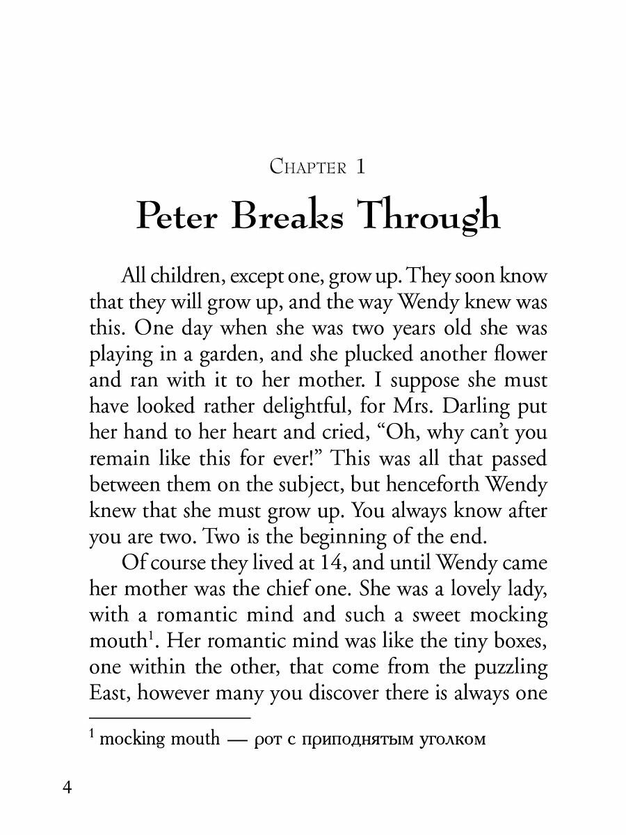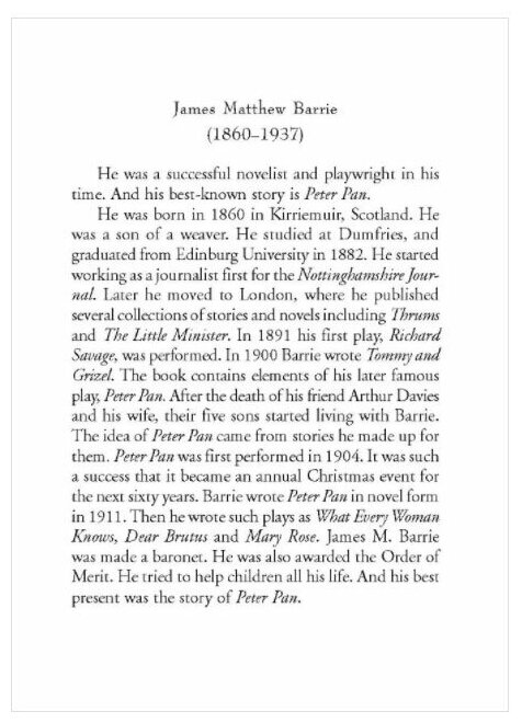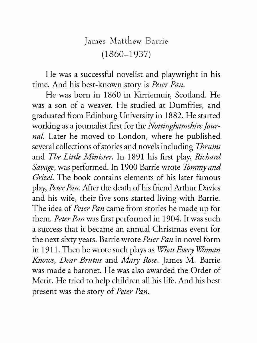 Книга содержит оригинальный текст известной детской повести о чудесном мальчике Питере Пэне шотландского писателя Джеймса Барри.