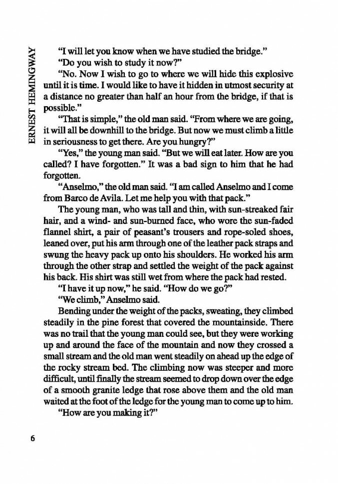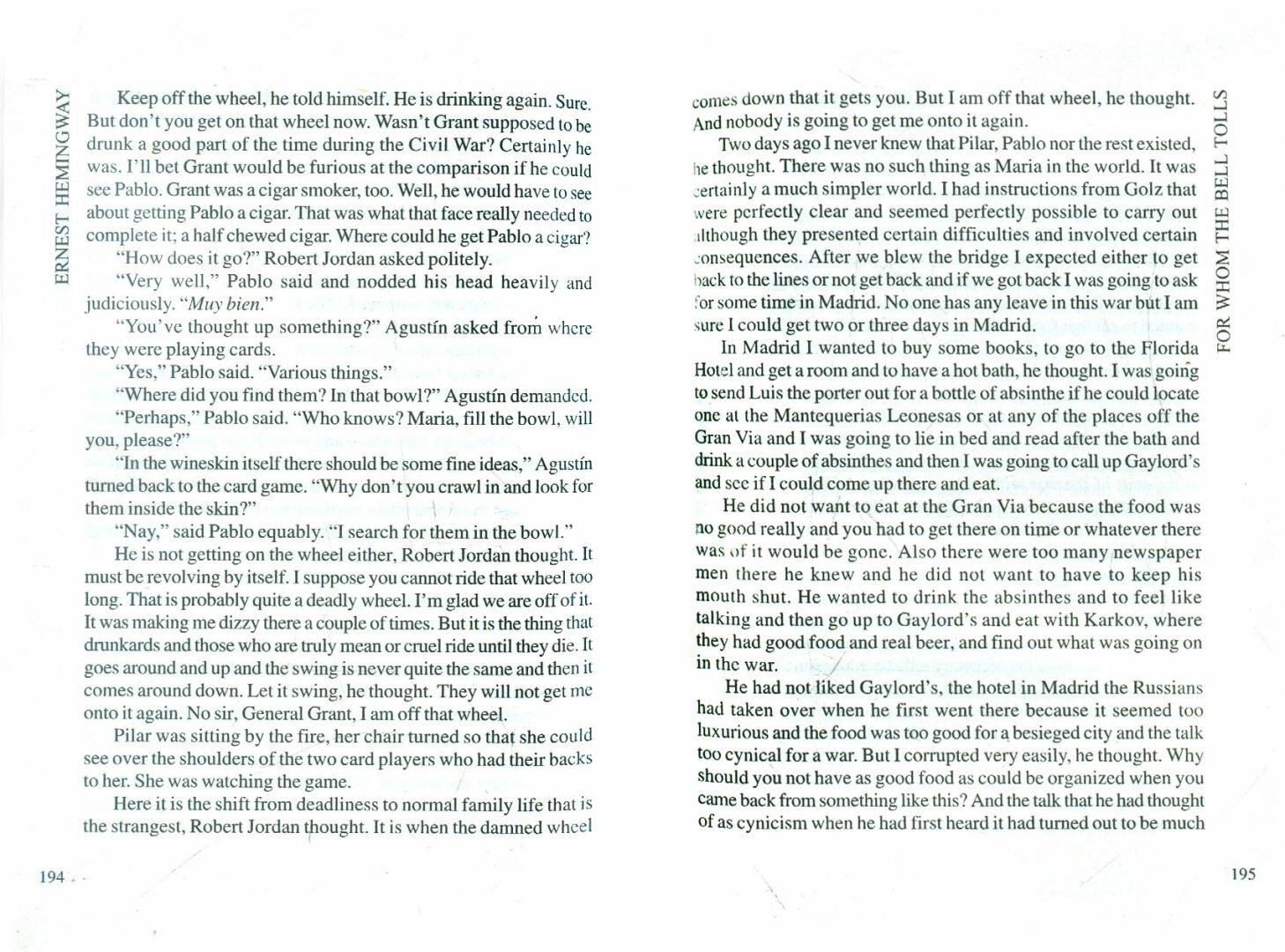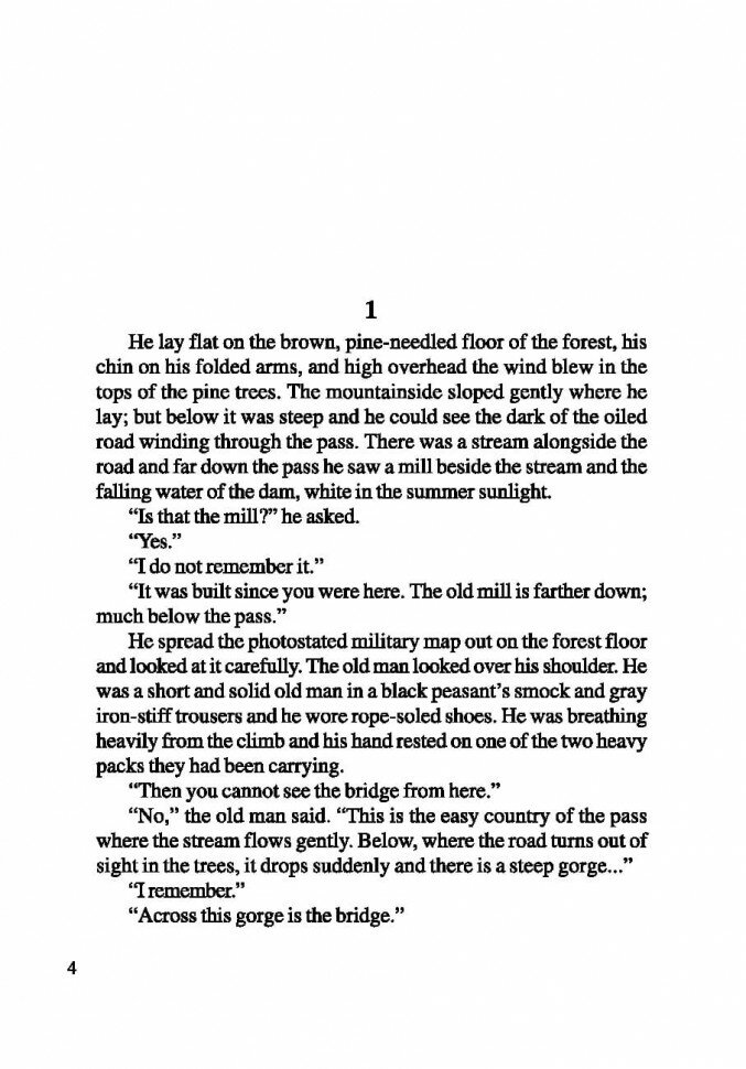 "По ком звонит колокол" один из лучших романов писателя, написанный по пережитым впечатлениям в годы Гражданской войны в Испании. В нем главный герой, бывший преподаватель Роберт Джордан, меняет свой мирный труд на работу подрывника. Трагичный роман воспевает истинную любовь и истинное мужество человека, пожертвовавшего своей жизнью ради жизни других.