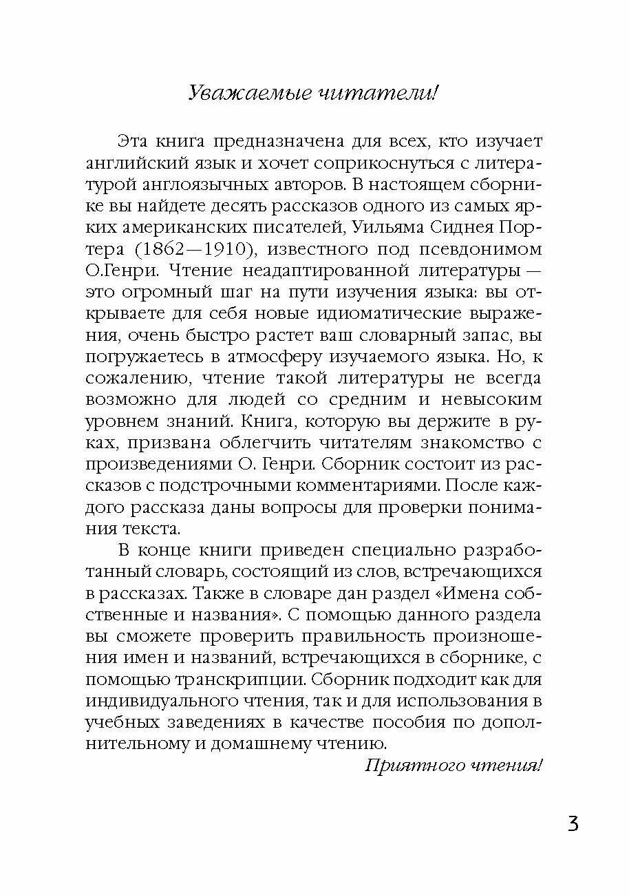Сборник включает в себя десять рассказов одного из самых ярких американских писателей. Для облегчения понимания оригинального текста даны комментарии с объяснением сложных языковых конструкций и вопросы к тексту. В конце книги приведен словарь, состоящий из слов, встречающихся в рассказах.