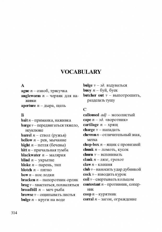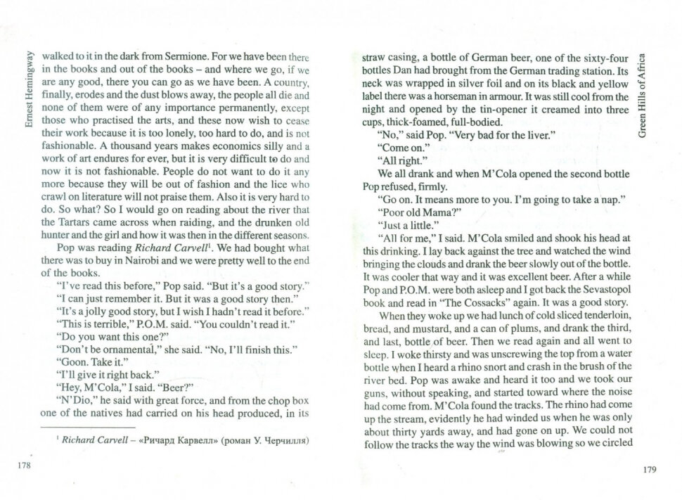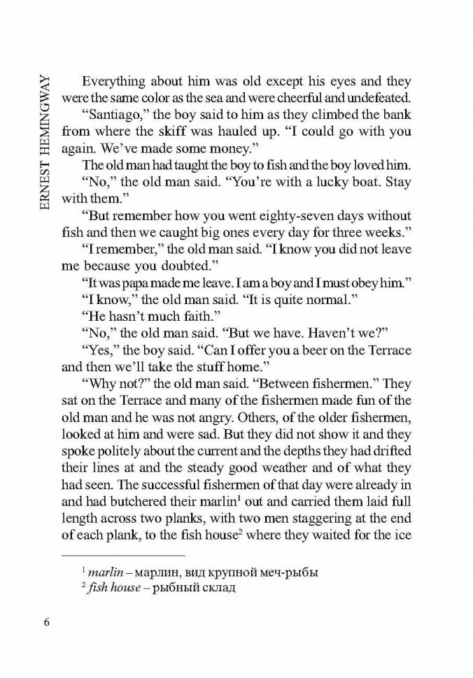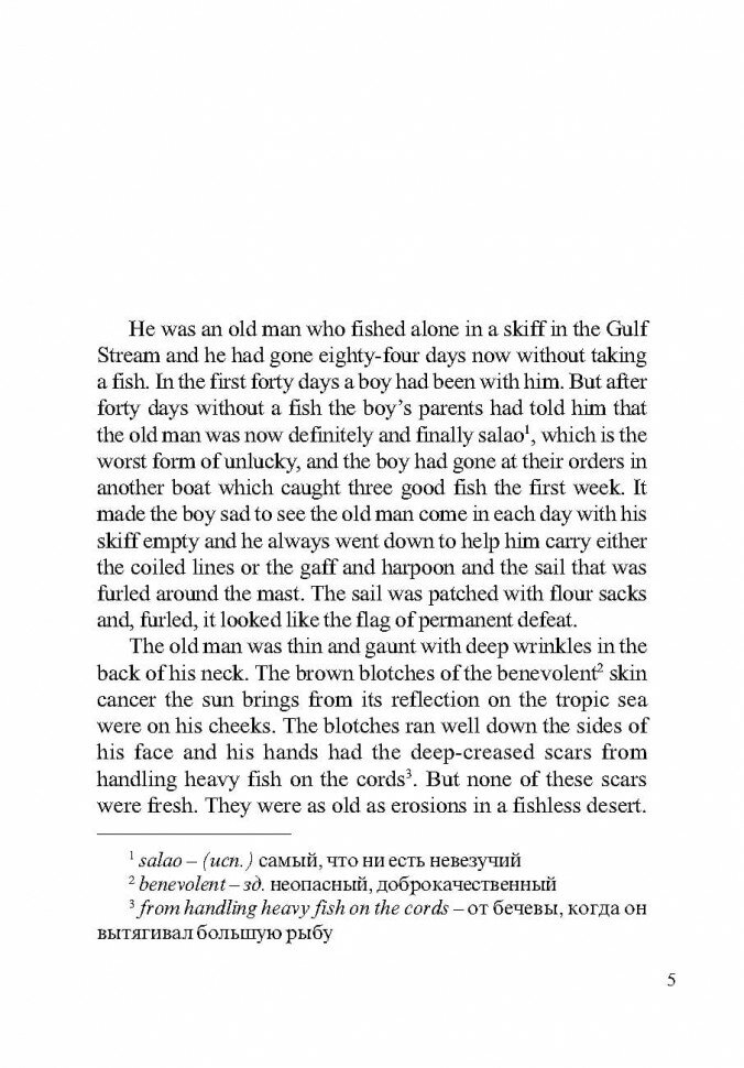 Это сборник, в который входят два произведения автора: "Старик и море" и "Зеленые холмы Африки". Как и на русском языке, чтение первого рассказа в оригинале захватывает полностью и дает ощущение причастности к ситуации и сопереживания героям, а Зеленые холмы - автобиографичная повесть писателя, содержащая множество размышлений и переживаний о литературе, судьбе писателя искусстве и т. д. Сноски с пояснениями почти на каждой странице содержат важную и интересную информацию (в основном, это переводы и пояснения целых фраз, либо устойчивых выражений).