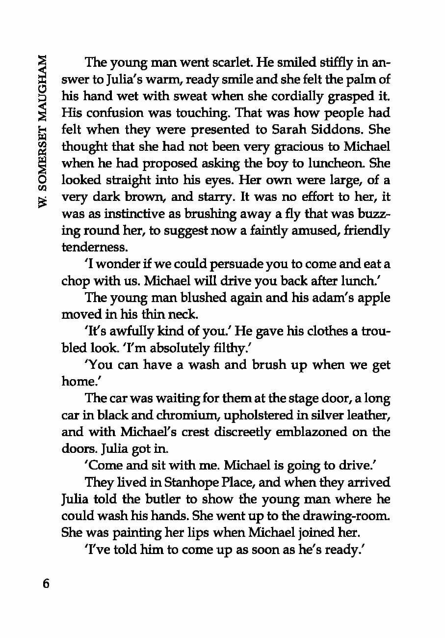 Захватывающий сюжет книги, заставляет читателя прочитать книгу от корки до корки на одном дыхание. Главная изюминка этого романа заключается в том, что главная, Джулия Лэмберт, имеет много сходств с самим Моэмом: совпадает история их детства, а также и тот факт, что Джулия - гений актерского мастерства.