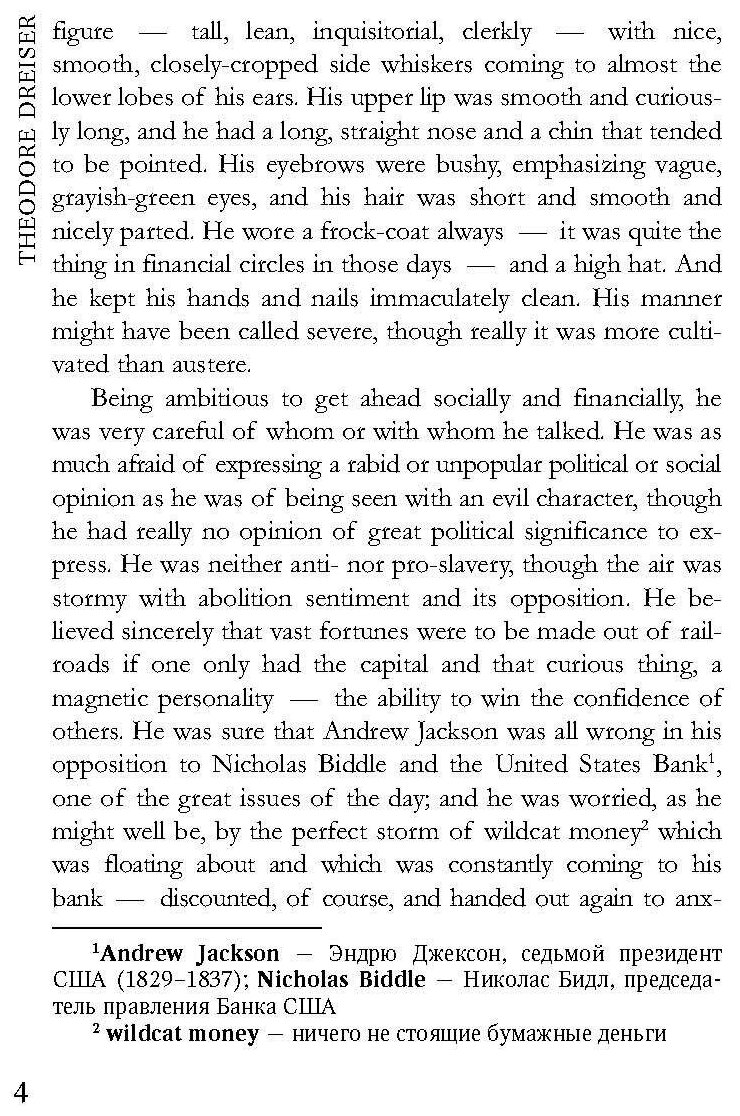 Драйзер помещает “одержимого гения” Каупервуда в мир не чистых на руку политиков и грязных дельцов Филадельфии второй половины XIX века, который как нельзя лучше обнажает темную природу людей, готовых на все ради выживания в “финансовых джунглях”. Книга будет интересна еще и потому, что это мир кажется столь знакомым человеку реалий XXI века: как не грустно это признать, но за 150 лет мы не изменились и вряд ли изменимся.