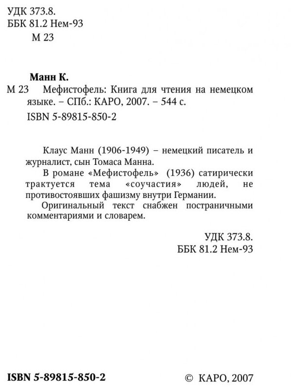 Mephisto / Мефистофель. Книга для чтения на немецком языке (Клаус Манн); КАРО, 2007