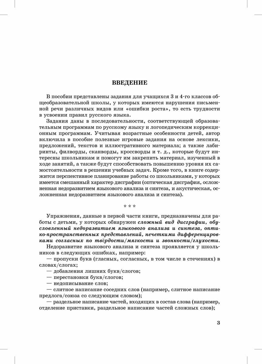 В пособии представлено 122 комплекса разнообразных заданий и упражнений для учащихся 3-4 классов общеобразовательной школы, у которых имеются нарушения письменной речи различных видов или "ошибки роста", то есть трудности в усвоении правил русского языка. Задания даны в последовательности, соответствующей образовательным программам по русскому языку и логопедическим коррекционным программам. Учитывая возрастные особенности детей, автор включила в пособие полезные игровые задания на основе лексики, предложений, текстов и иллюстративного материала; а также филлворды, сканворды, кроссворды и т.д. Игровые упражнения, во-первых, будут интересны школьникам, во-вторых, повысят уровень их самостоятельности в решении учебных задач и, в-третьих, помогут им закрепить материал, изученный в ходе занятий.