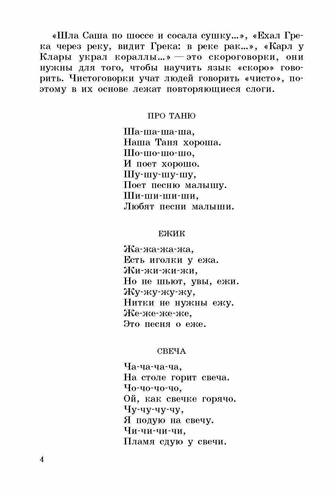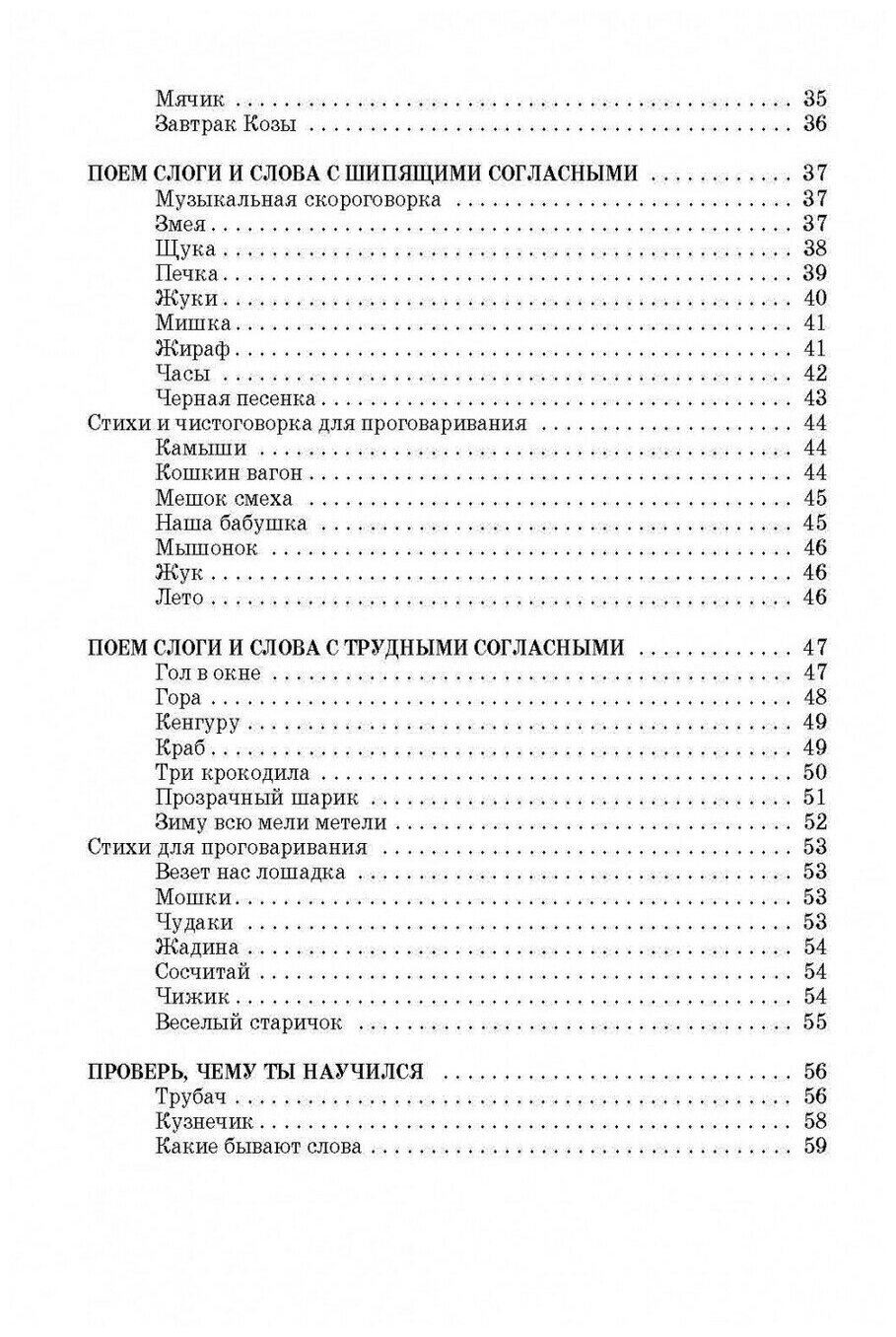 О достоинствах литературного текста мы здесь не говорим, потому как он предназначен для отработки тех или иных звуков. Кроме распевок книжка содержит итересные скороговорки и чистоговорки. -