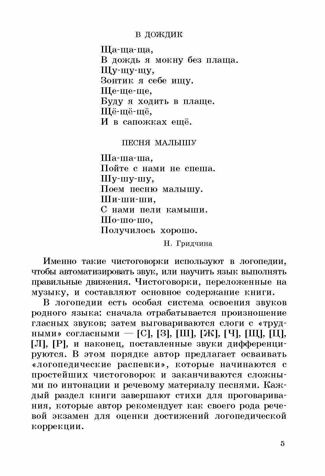 В логопедии есть своя особая система освоения звуков родного языка: сначала отрабатывается произношение гласных звуков; затем выговариваются слоги с "трудными" согласными - [с], [з], [ш], [ж], [ч], [щ], [ц], [л], [р], и наконец, поставленные звуки дифференцируются. Именно в этом порядке автор предлагает осваивать "логопедические распевки", которые начинаются с простейших чистоговорок и заканчиваются сложными по интонации и содержанию и речевому материалу песнями. Каждый музыкальный раздел завершается стихотворениями для проговаривания, которые автор рекомендует как своего рода речевой экзамен для оценки достижений в логопедической коррекции. Проговаривание стихотворений и песенок для лучшего запоминания предлагается сопровождать специально подобранными для дошкольников упражнениями. Книга может быть полезна логопедам, дефектологам, музыкальным руководителям в детских садах, в коррекционных образовательных учреждениях, в хоровых и театральных студиях, а также родителям.