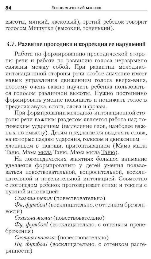 Книга напечатана на хорошей белой бумаге, удобного формата, в мягкой обложке. Помимо подробного описания самого массажа, приведены главы о перинатальной патологии ЦНС и дизартрических нарушениях и их преодолении у детей раннего и дошкольного возраста.Приведена карта подробного логопедического обследования и варианты логопедического заключения. Примерно треть книги - это иллюстративный материал по теме - примеры нарушения тонуса лицевой мускулатуры и непосредственно фотографии приемов массажа. Они черно-белые, но людям имеющим представление о логопедическом массаже все должно быть понятно. Массаж щетками - более удобная альтернатива зондовому массажу, а обучить ему родителей гораздо проще. Книгой осталась довольна все по делу, точно и понятно. Спасибо большое автору!