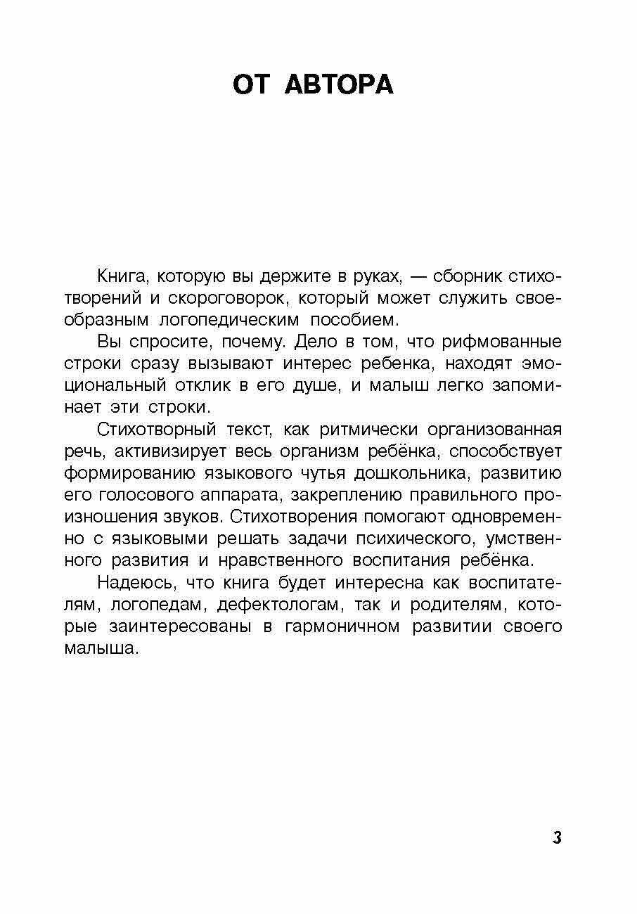 Книга представляет собой сборник стихотворений и скороговорок. Поэтическое слово способствует обогащению лексики, развитию языкового чутья у детей. Стихотворный текст как ритмически организованная речь активизирует весь организм дошкольника, способствует развитию его голосового аппарата, закреплению правильного произношения звуков. Стихотворения находят эмоциональный отклик в душе ребенка, делают увлекательным предлагаемый к изучению материал, а педагогам и родителям они помогают одновременно с речевыми решать задачи психического, умственного развития и нравственного воспитания малыша.
