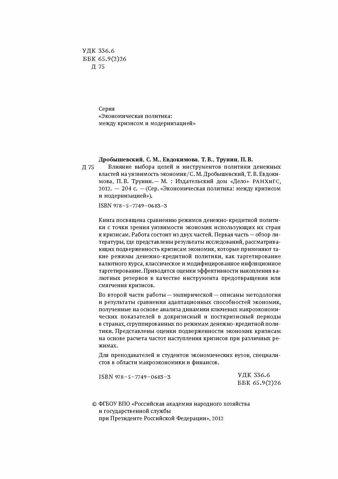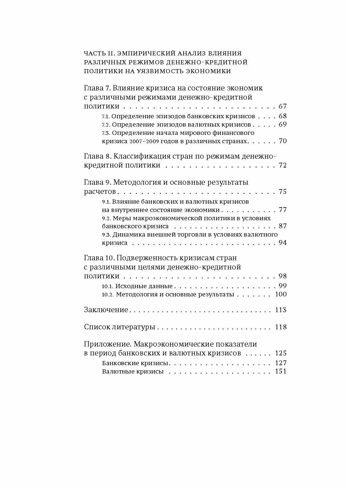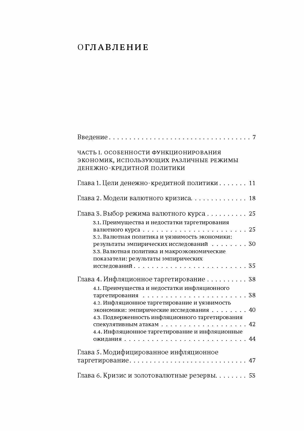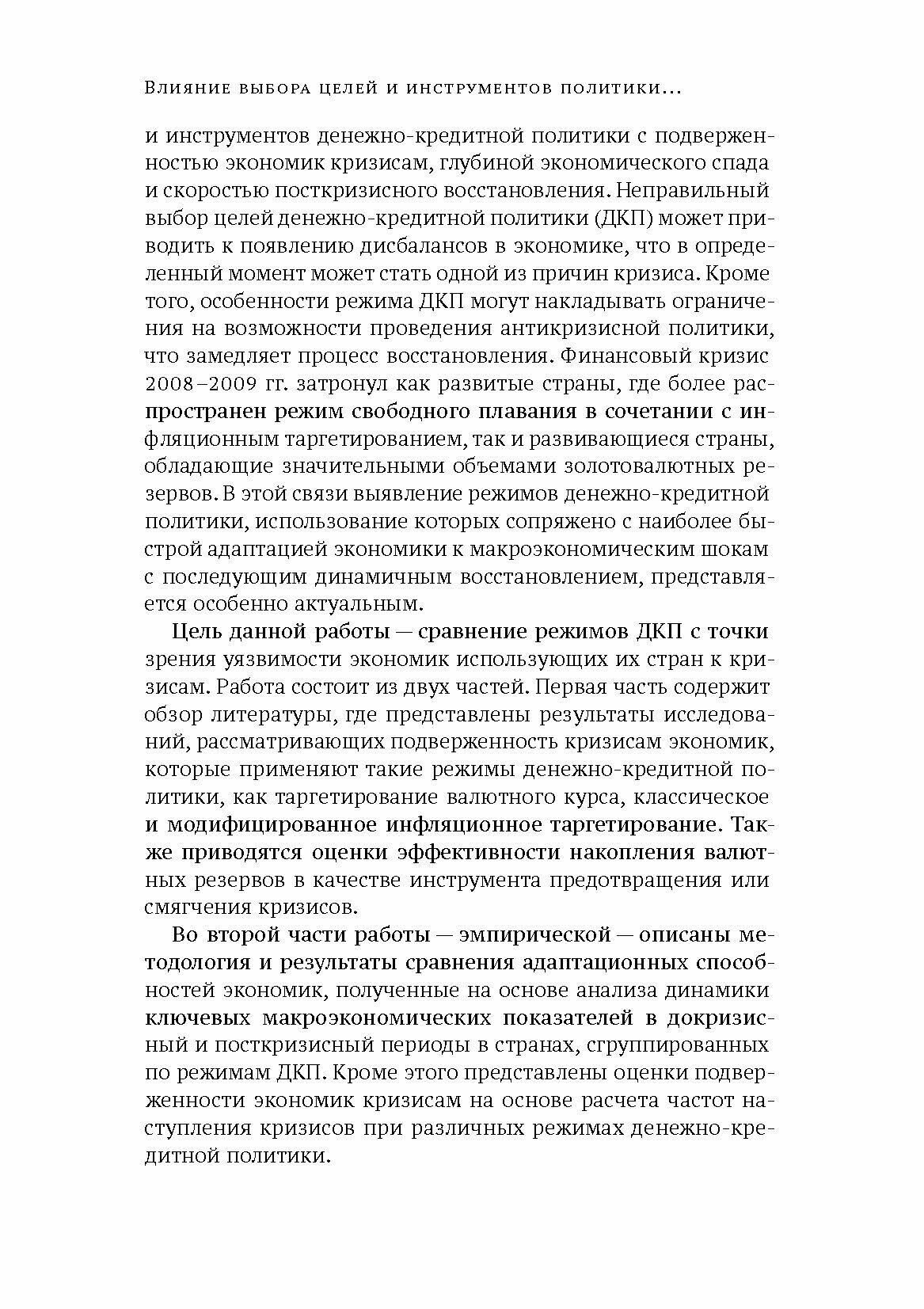 Книга посвящена сравнению режимов денежно-кредитной политики с точки зрения уязвимости экономик использующих их стран к кризисам. Работа состоит из двух частей. Первая часть - обзор литературы, где представлены результаты исследований, рассматривающих подверженность кризисам экономик, которые применяют такие режимы денежно-кредитной политики, как таргетирование валютного курса, классическое и модифицированное инфляционное таргетирование. Приводятся оценки эффективности накопления валютных резервов в качестве инструмента предотвращения или смягчения кризисов.