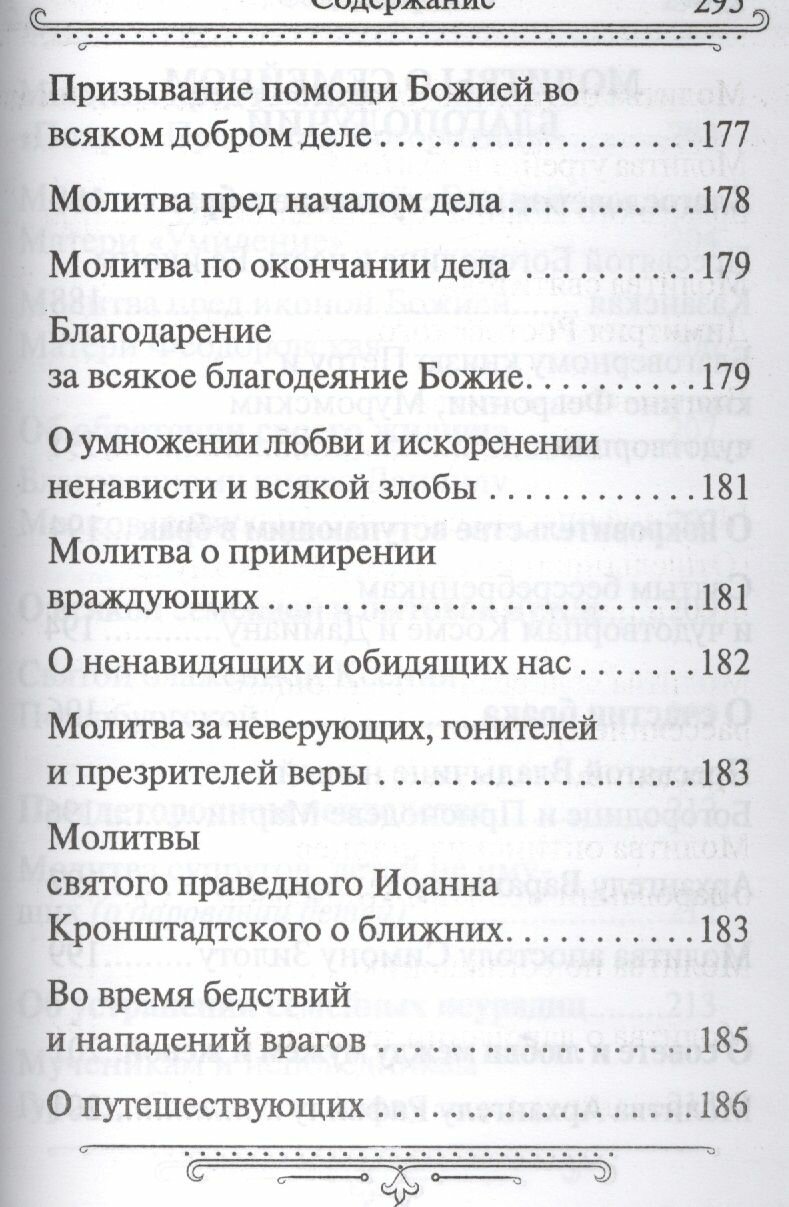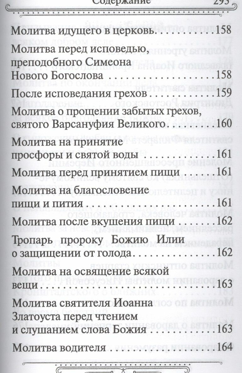 II. Молитвы на всякие случаи жизни (перечислю некоторые из них): о даровании молитвы, в день Нового года, перед выходом из дома, перед исповедью, о прощении забытых грехов, перед принятием пищи, после вкушения пищи, на освящение всякой вещи, молитва водителя, молитвы о даровании терпения, разумения, о путешествующих и др.