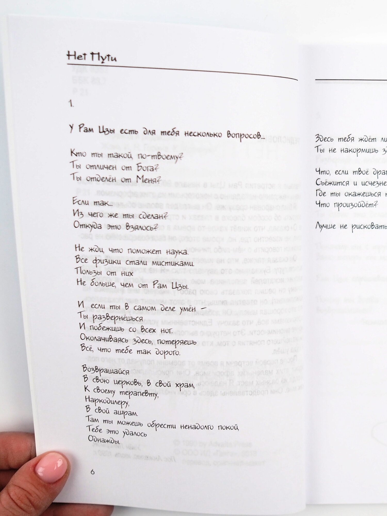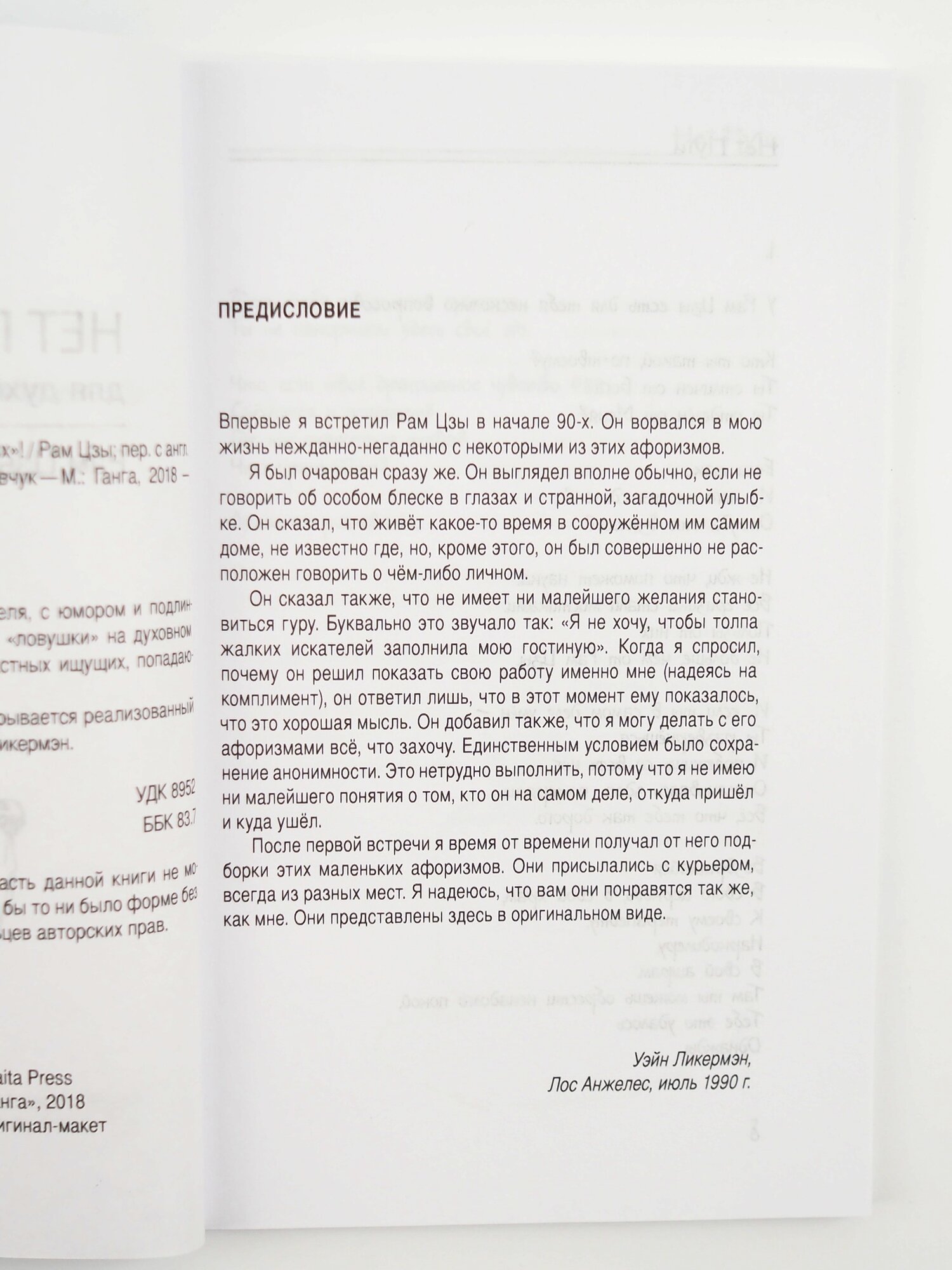 Очень крутая книжка. В процессе чтения падаешь с пъедестала представлений о себе и о "правильной духовности". Рам Цзы удалось передать нечто такое, что находится за пределами слов и двойственного понимания. Пробуждающий эффект! Перечитываю снова и снова. И, кстати, да, это вовсе не обрезанный вариант, текст такой же как в электронном виде (только вступление другое, более "мягкое"))).