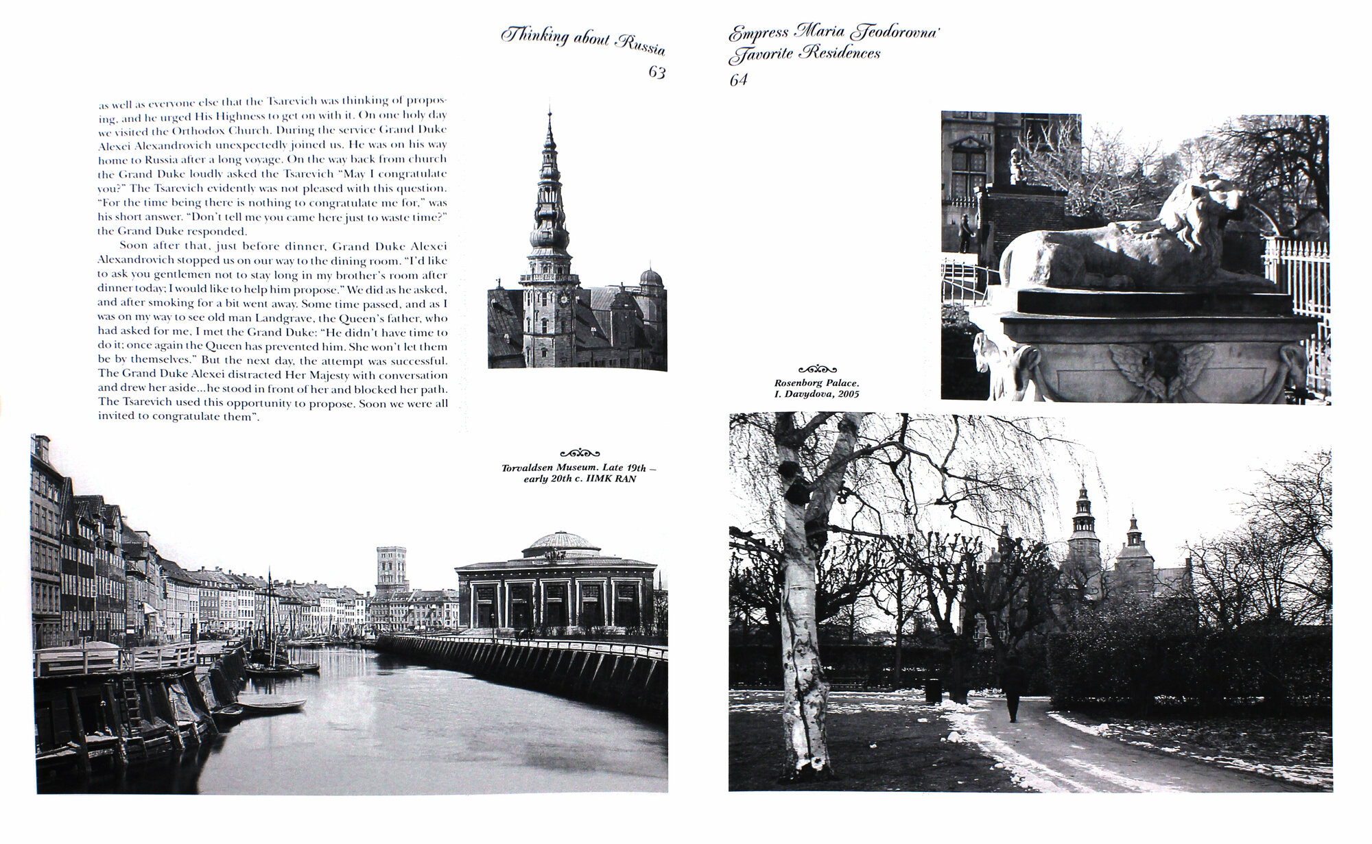 Only one chapter of this book is not connected directly with Maria Feodorovna's residences. That chapter is devoted to St. Alexander Nevsky Orthodox Church in Copenhagen, which was built according to the wishes and by the financial means of the Imperial Russian family. The Church played an important role in Maria Feodorovna's life because of her ton-version to Russian Orthodoxy before her marriage. She strictly and sincerely followed the main doctrines of that religion, assisted the poor and indigent, and gave much of her energy and money to charity and patronage of the arts. When Maria Feodorovna visited Denmark she would travel from wherever she was staying to St. Alexander Nevsky Church to worship. It is no coincidence that the funeral procession carrying her remains traveled down Bredgade Street in September, 2006. The citizens of Copenhagen paid their Princess their last respects at that place.