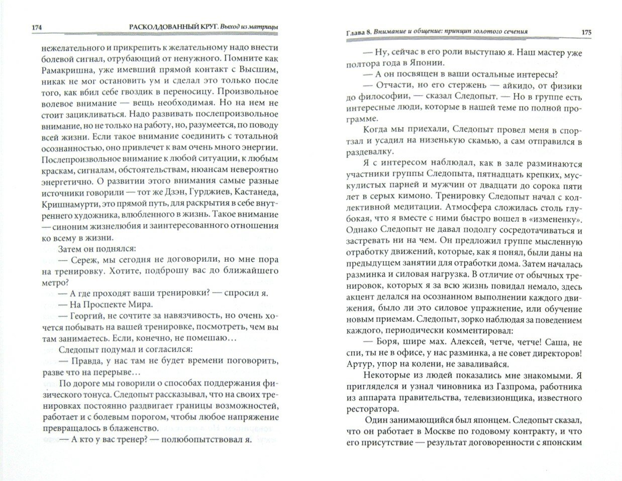Третья книга - "Выход из матрицы", развивая идеи первых двух, дает конкретную стратегию жизни, выводящую человека из матрицы суеты, рутины и повторяемости событий в состояние свободы, самореализации, успеха и гармонии с собой. Новый жанр книги - психологический роман-инициация - вооружает читателя реальными практиками, которые помогают осознать работу мировой "небесной спирали" - силы, соединяющей вселенную и человека. Подключение к ней резко ускоряет эволюцию сознания. Детективный сюжет искания тайны и завязки ряда сюжетных линий, намеченных в предыдущих книгах, получают свое разрешение в третьей книге. Тайна в целом разгадана: автору удалось проникнуть в загадочный алгоритм Девяти Законов, реально изменяющих жизнь к лучшему, и осуществить его в своей жизни и жизни "контрольной группы" его учеников.