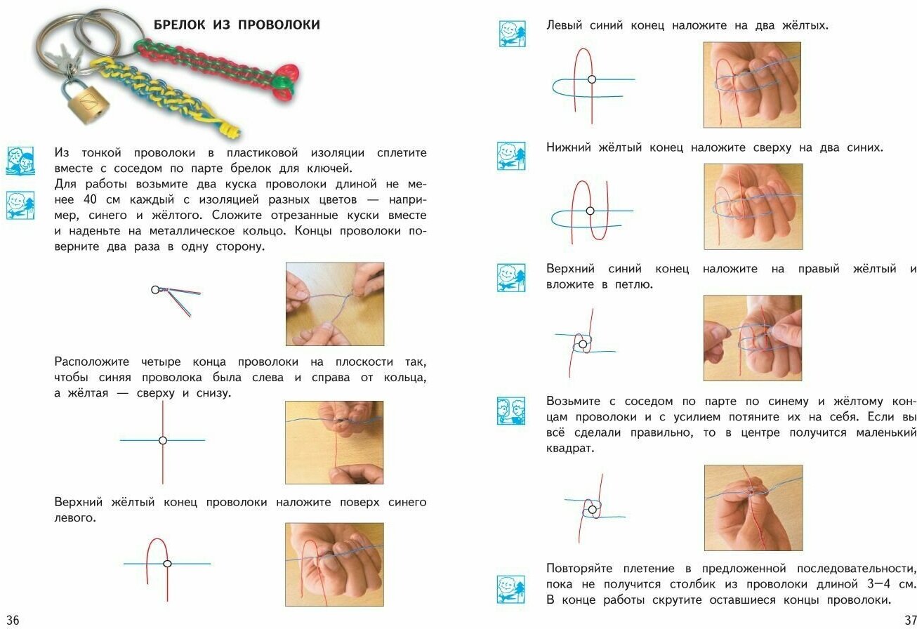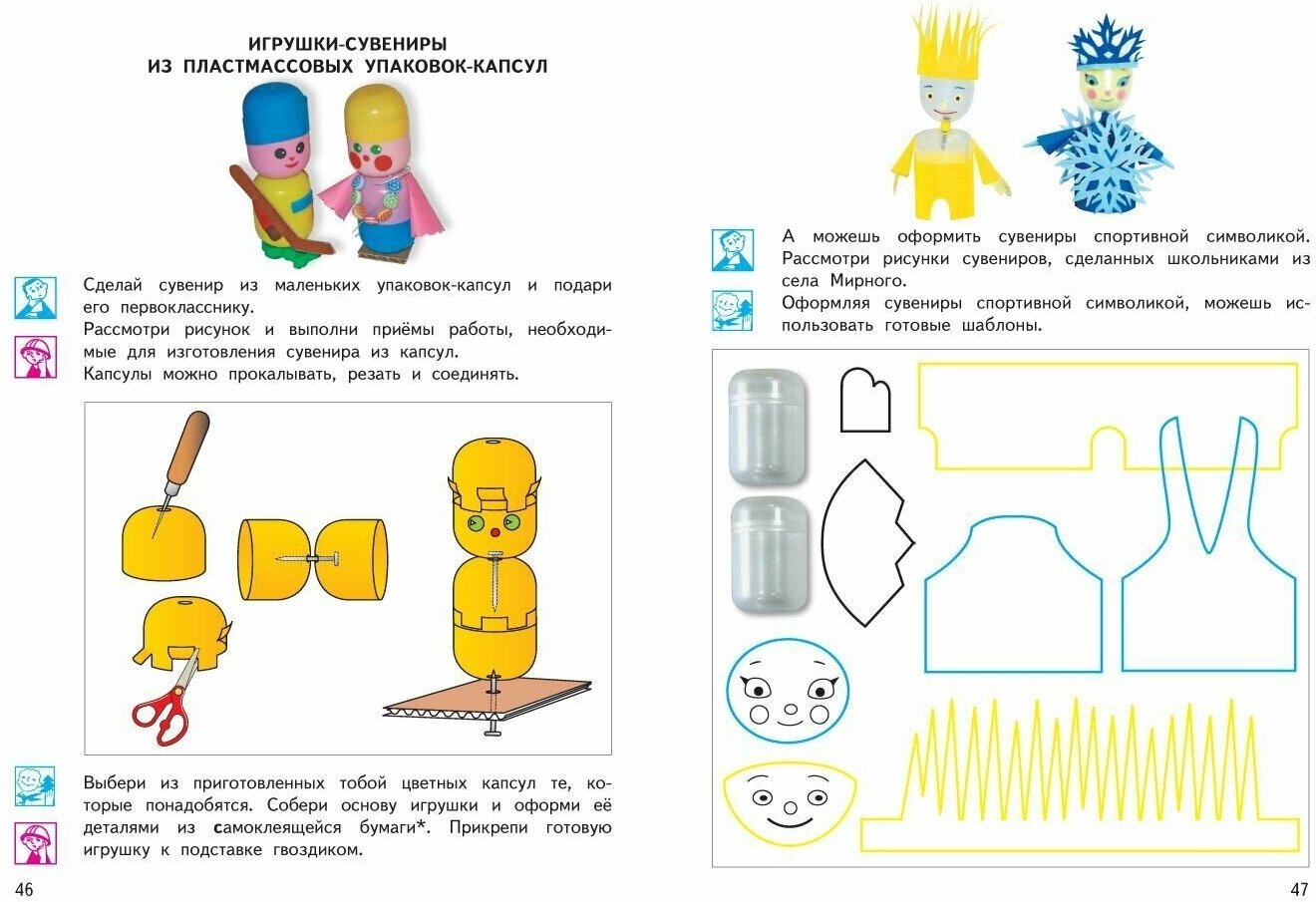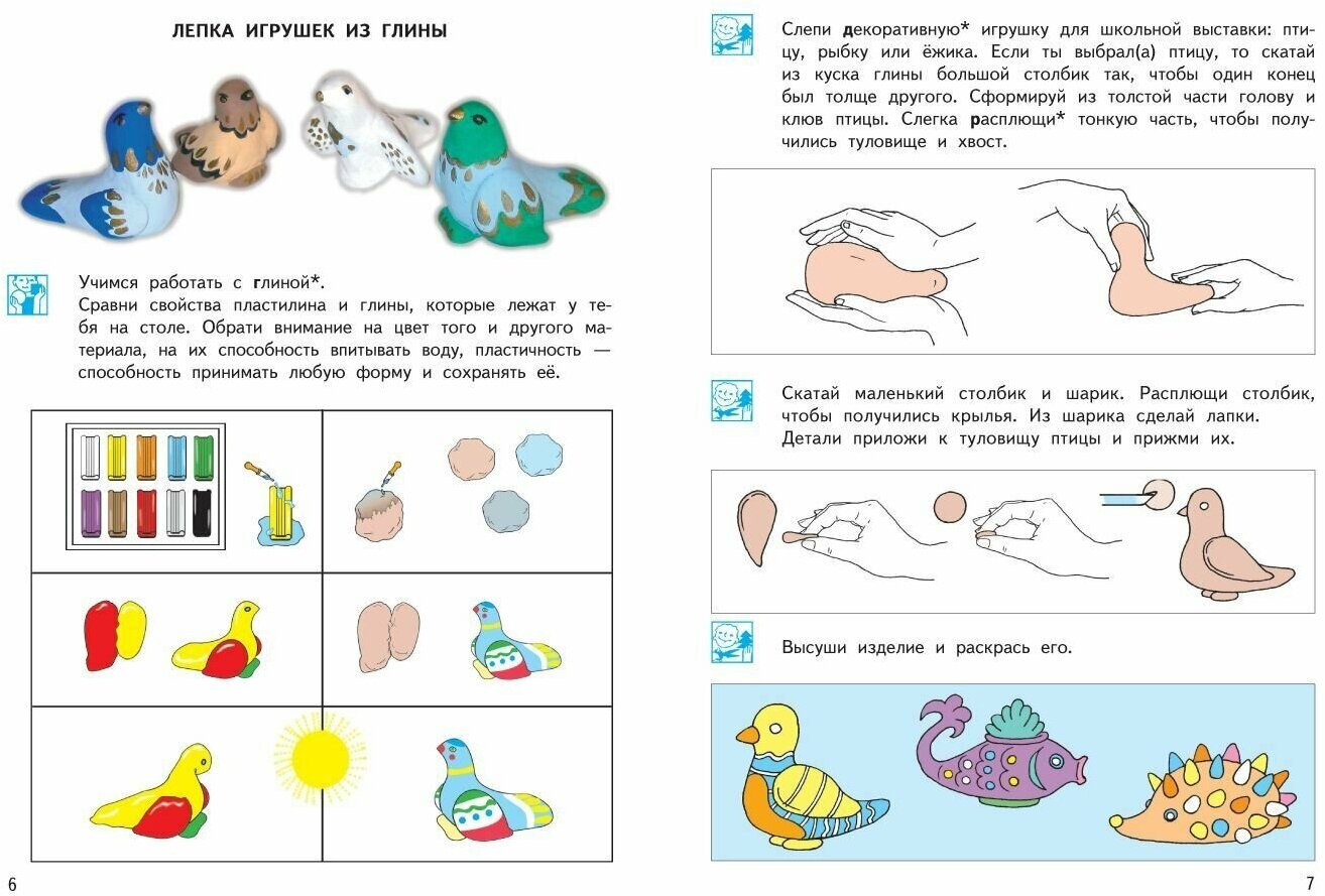 Учебник чуть меньше формата А4, обложка картонная, страницы тонкие, белые. В принципе, методика обучения стандартная. Дети учатся лепить из глины, работать с картоном и бумагой, делать аппликации из ниток, брелки из проволоки, вышивать, мастерить из металлического конструктора. В конце учебника идет глава, посвященная практическому обручению работе на компьютере. Ученики знакомятся с устройствами для работы с информацией, учатся работать на компьютере в программе для создания презентаций и графическом редакторе.