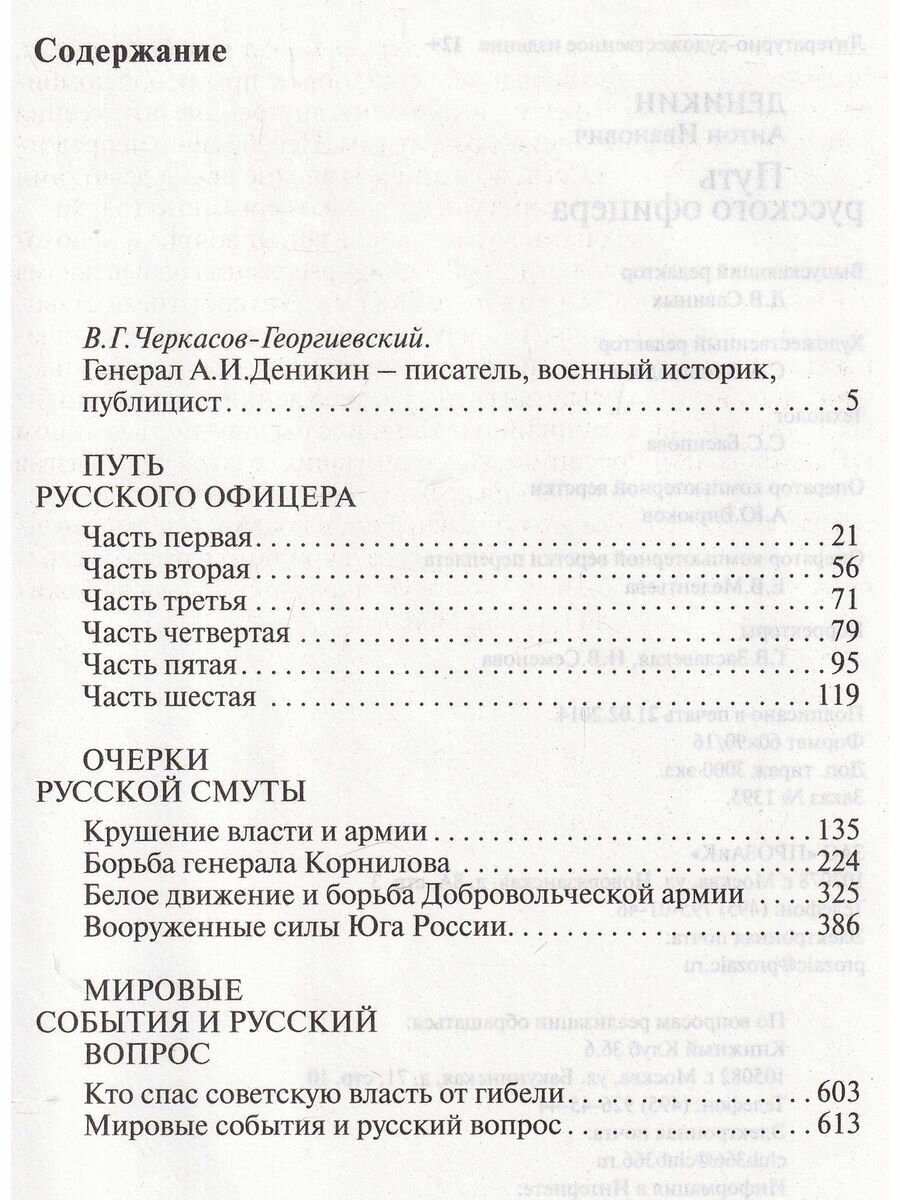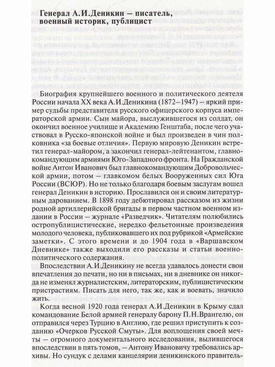 В сборник Антона Ивановича Деникина (1872-1947) вошли незавершенная книга "Путь русского офицера", фрагменты из пятитомных "Очерков Русской Смуты", а также избранные статьи автора. В мемуарах знаменитого генерала прослеживается история России на протяжении почти пятидесяти лет. Здесь и описание военных кампаний, и живые картины быта русской армии, и портреты военачальников и государственных деятелей. Но кроме того - подробное изложение событий Гражданской войны, глубокий анализ политической обстановки тех "роковых лет", полные искренней тревоги рассуждения о судьбах Отечества.