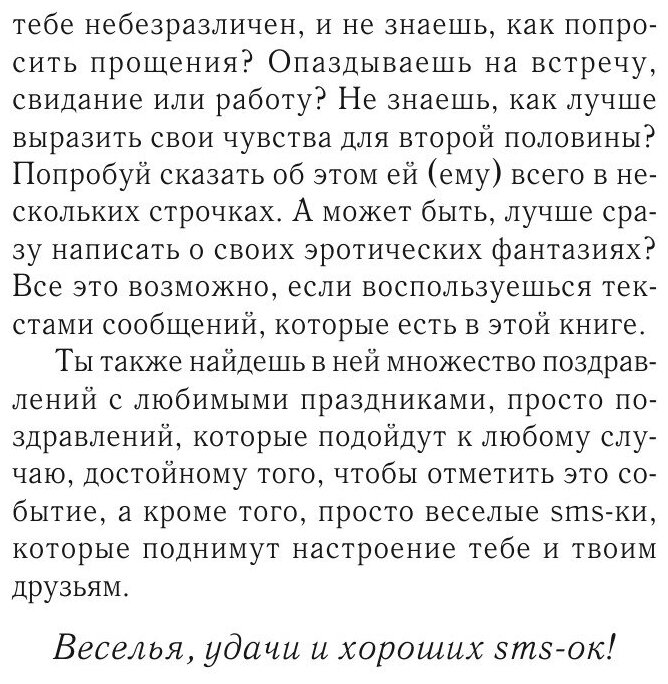 В этой книге собраны самые лучшие, самые новые, самые оригинальные sms-послания, подходящие для самых разных случаев: обидели ли вы человека и не знаете, как попросить прощения, опаздываете ли на встречу, свидание или работу и не представляете, что можно написать и т.д. и т.п. Также в книге содержатся самые различные поздравления и просто веселые sms-ки, которые поднимут настроение вам и вашим друзьям.