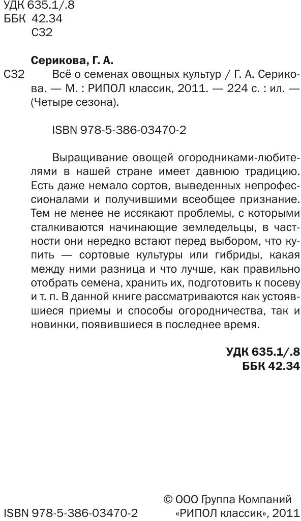 Сервис сравнения цен СкидкаГИД предлагает сравнить цены на товар «Книга: Все о семенах овощных культур (Галина Серикова); РИПОЛ Классик, 2011»