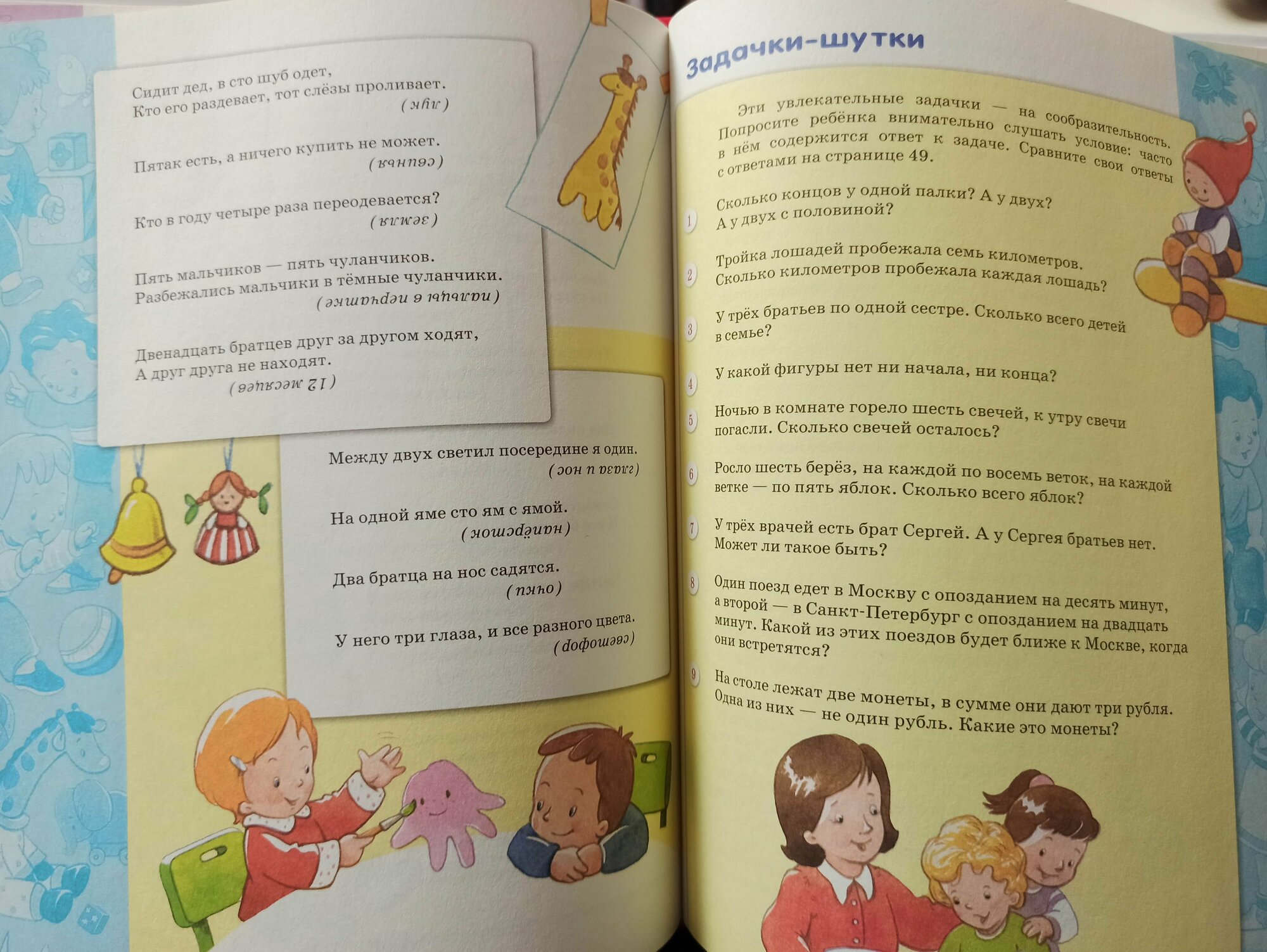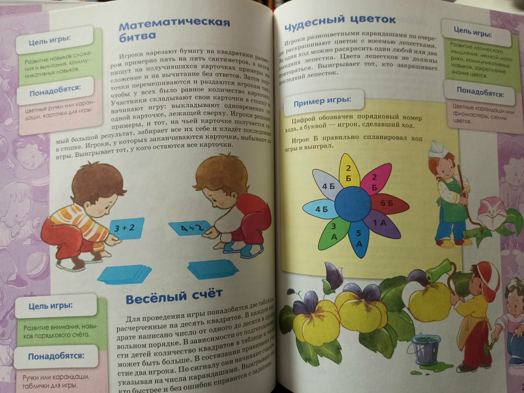 Только вчера получила книгу и осталась довольна покупкой. Красочно, много материала для проведения досуга. Это и подвижные игры, и настольные, логические, с математическим уклоном, загадки и задачи-шутки. Предлагаются также игры "Собери группу", "Словарный поединок", "20 весёлых рыбок", "Дрессированный жук". Конструирование на плоскости "Овал" и "Квадрат". Возраст, на мой взгляд, от 3-7 лет и младших школьников.