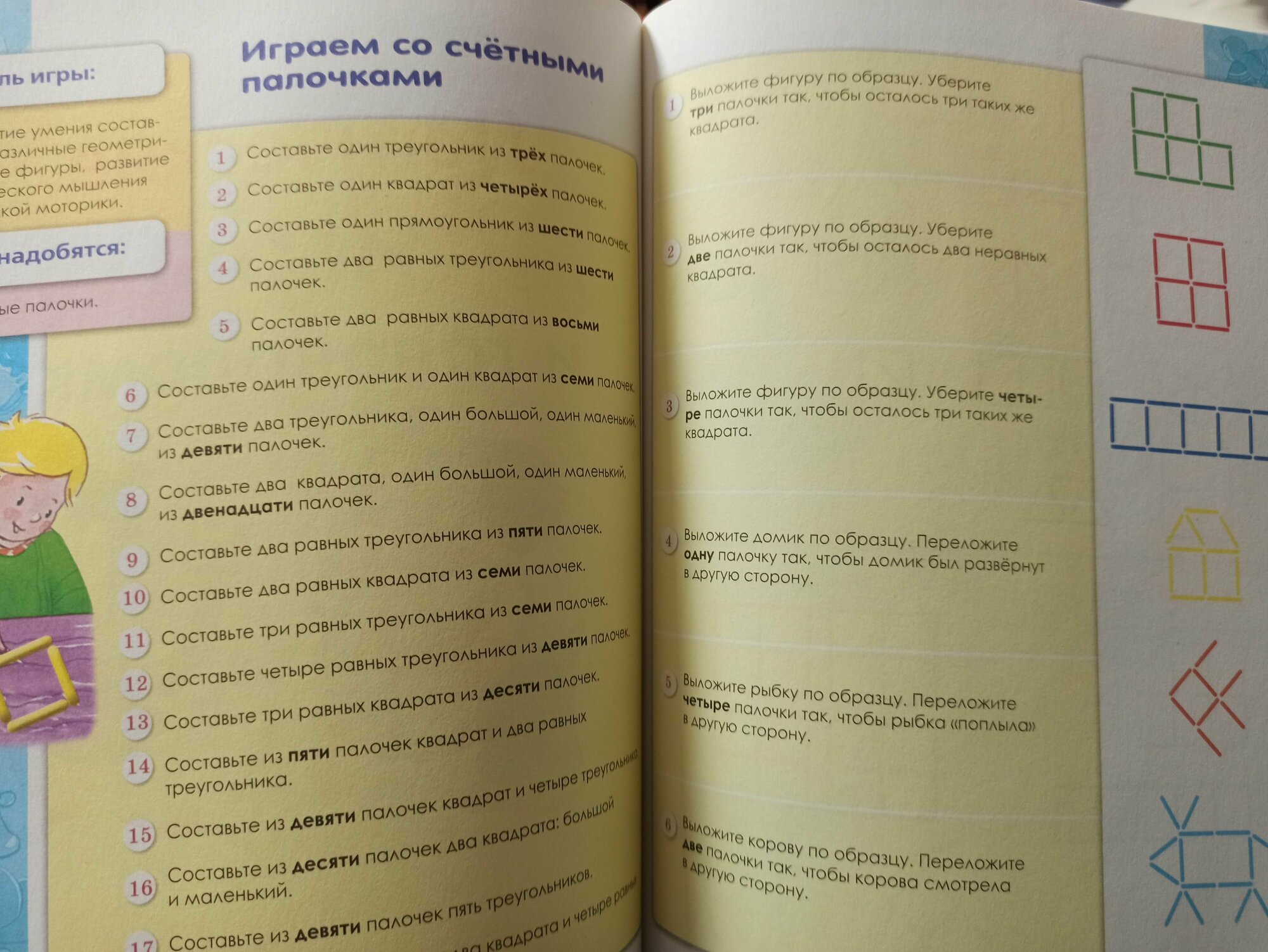 Внешнее оформление просто замечательное. Красочное, яркое. Бумага внутри книги плотная, иллюстрации красивые, цвета насыщенные. Однако, название «Математические игры» несколько преувеличено. Из 4-х имеющихся разделов большая часть отведена «подвижным и ролевым играм» и «настольным играм». Логические игры и задачки-шутки, которые, на мой взгляд, все-таки косвенно относятся к математике, занимают 1/3 книги. То есть, если Вы хотели бы действительно заниматься именно математикой, данное издание не самое удачное. Вместе с тем, в книге действительно много интересного и занимательного. Книга поможет в дороге и на отдыхе занять и развлечь детей, так как под рукой есть все необходимое.