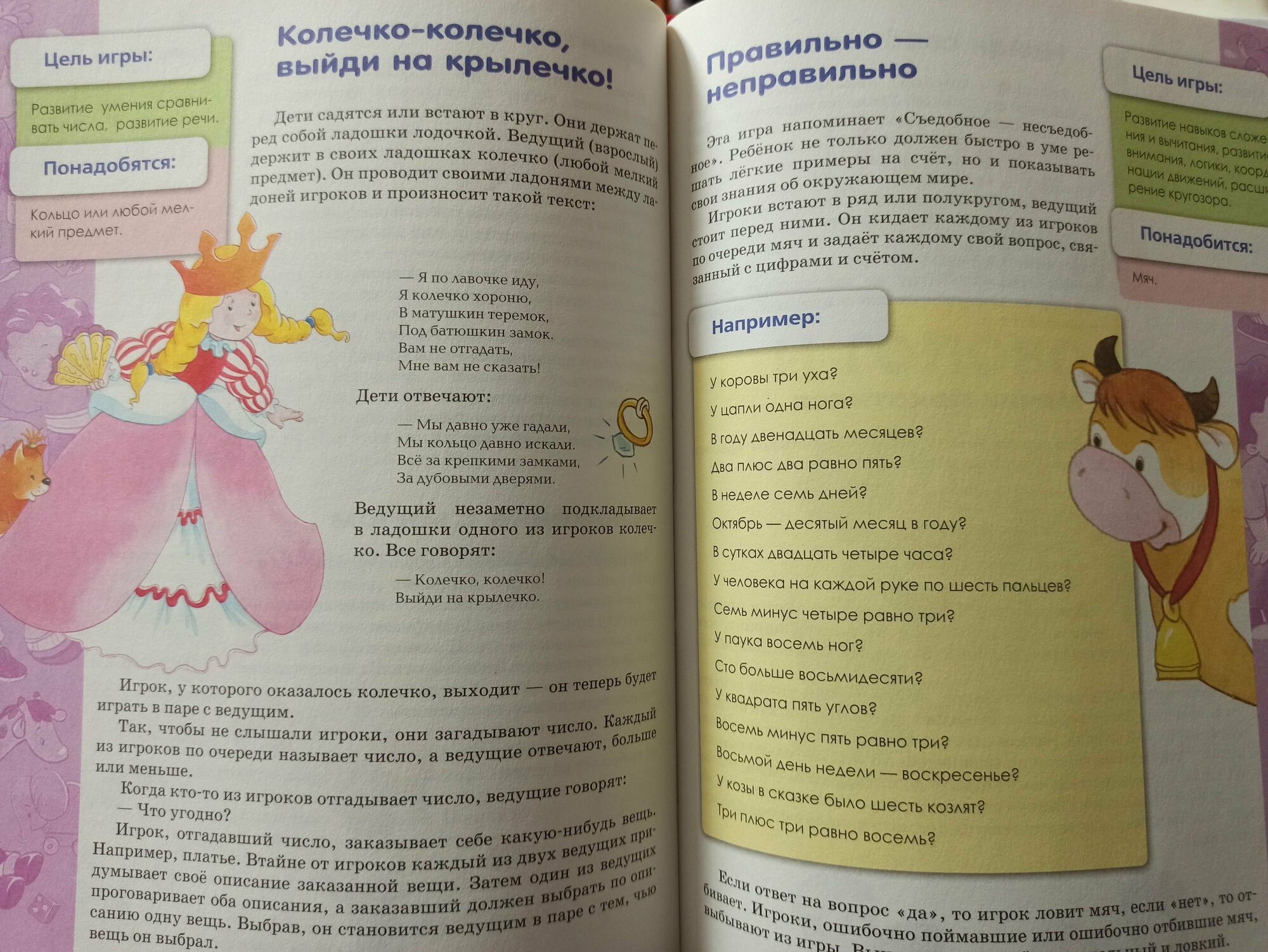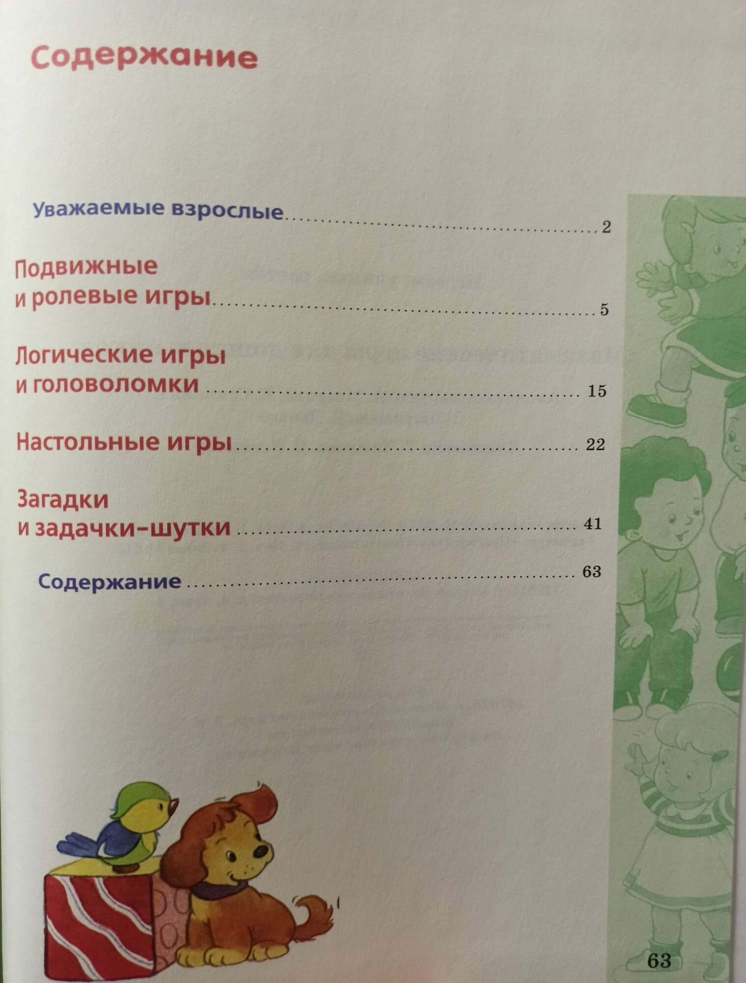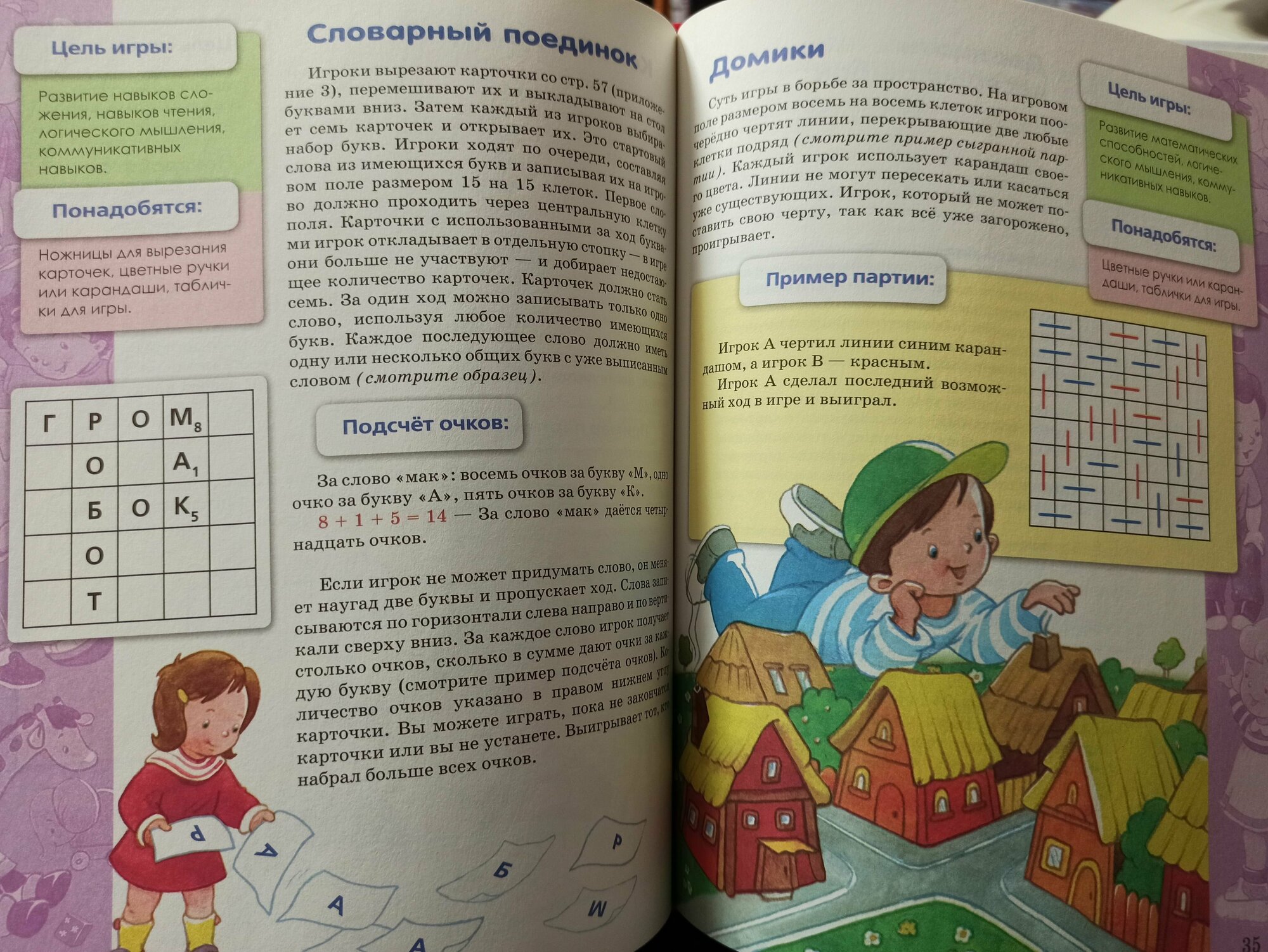 Во первых книга в твердом переплете что радует при частом использовании большой плюс. Во вторых игры разнообразные от подвижных до настольных. Смотрим по содержанию- подвижные и ролевые игры,логические игры и головоломки,настольные игры,загадки и задачки шутки. Есть приложения можно вырезать и играть. Игры как для детей индивидуально и для компании, для всей семьи, игры нашего детства так и новые. Оформление иллюстрации удобные. Книга для родителей, воспитателей и любознательных детей.