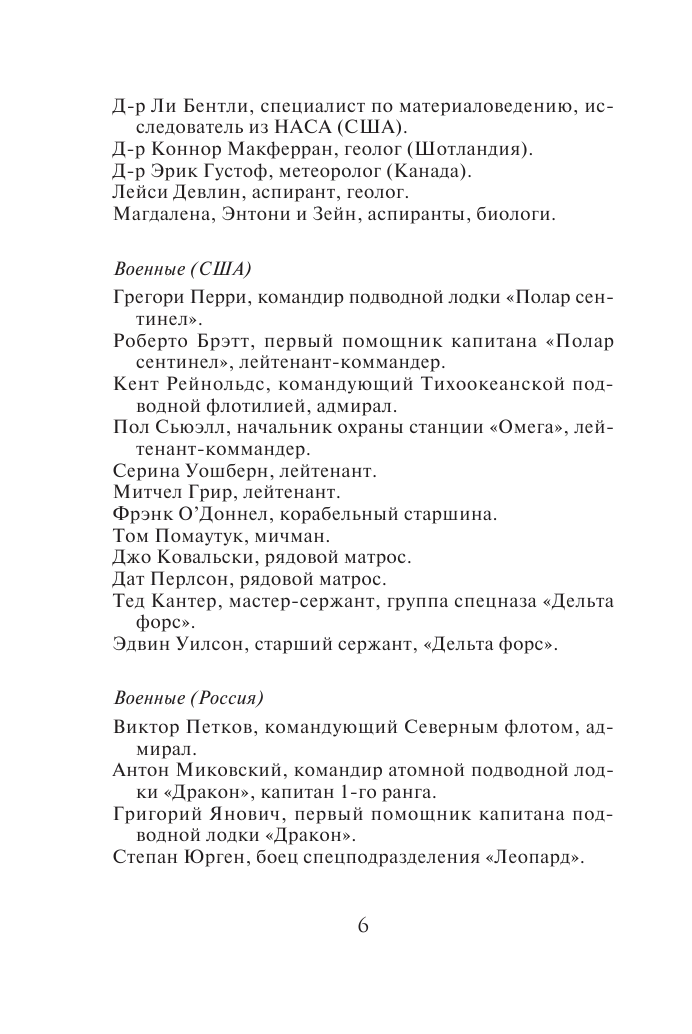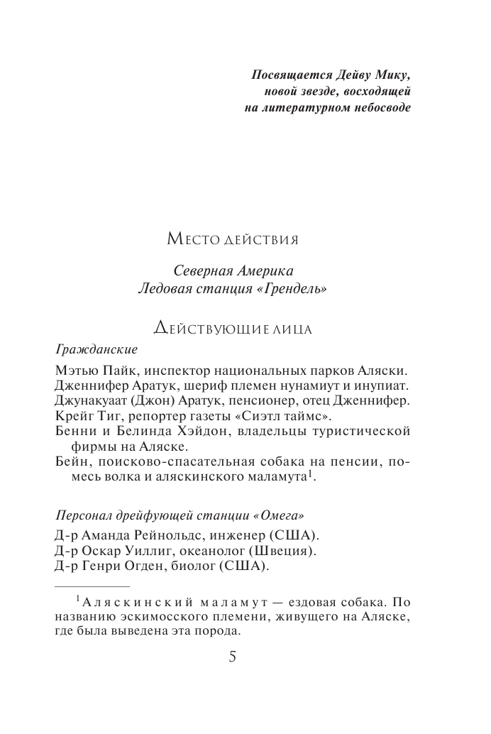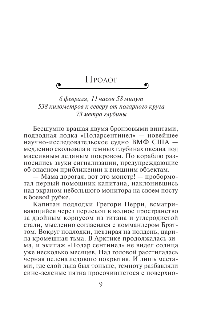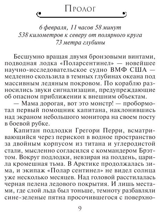 Первая половина книги , на мой взгляд, несколько затянута: ледовая станция, погибший персонал, выжившие древние животные, пожирающие всех и вся..., а вот вторая половина романа захватила. Ведь один из героев- журналист - вовсе не журналист, а агент ЦРУ, у которого цель - не оставлять свидетелей, русские, проводившие опыты над людьми,не виновны, а любовь главных героев - Мэтта и Дженни- смогла преодолеть все преграды.
