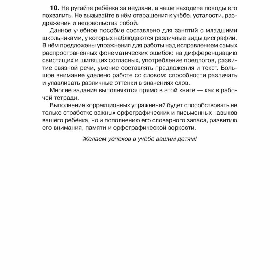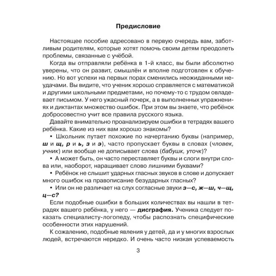 В книге предложены коррекционные упражнения по русскому языку для младших школьников, у которых есть проблемы в овладении грамотным письмом. Заниматься исправлением дисграфии всегда гораздо легче на раннем этапе её выявления, но приведённые упражнения будут эффективны для учеников любого возраста. Учебное пособие адресовано педагогам начальной школы и заботливым родителям, которые занимаются со своими детьми дома.